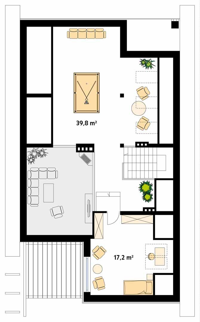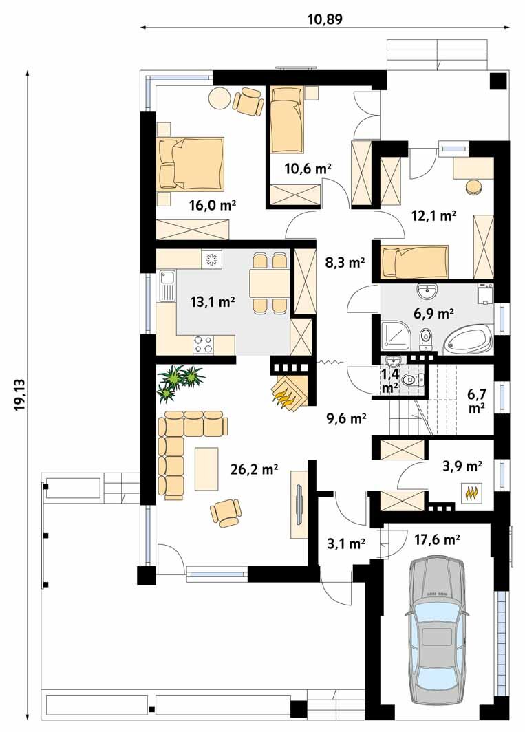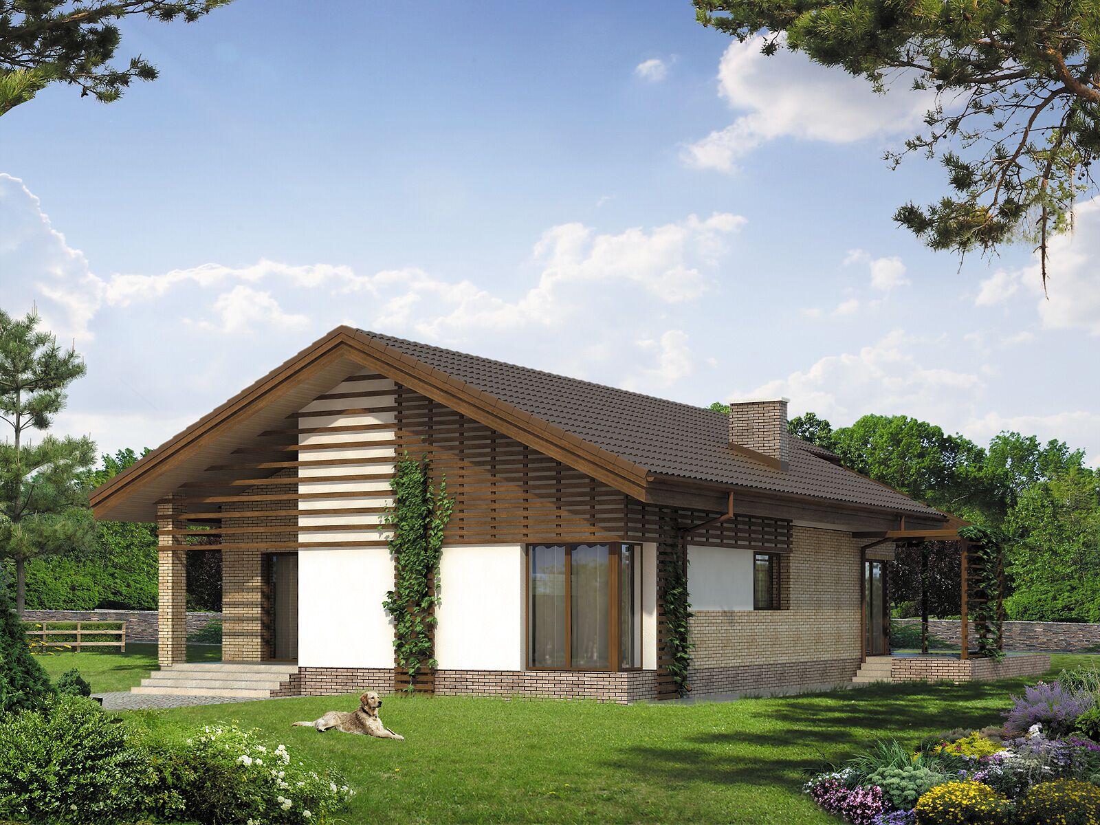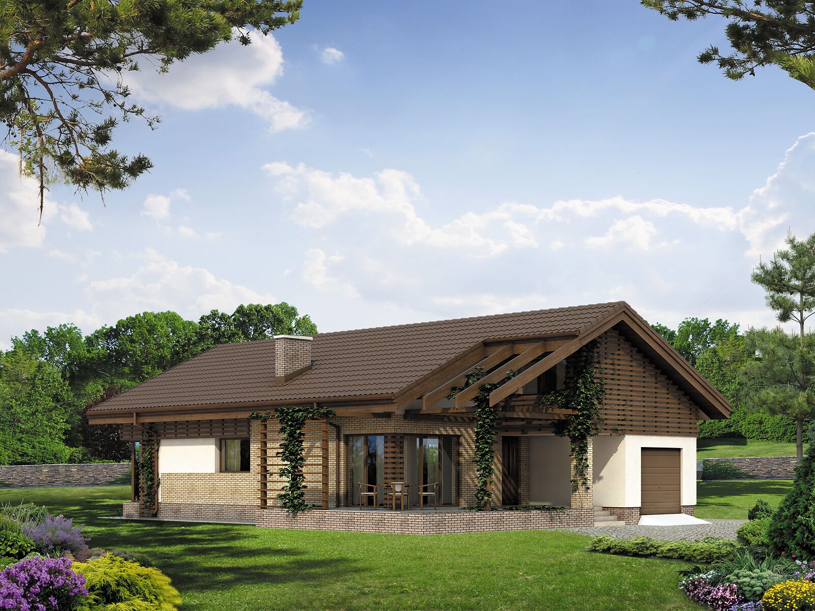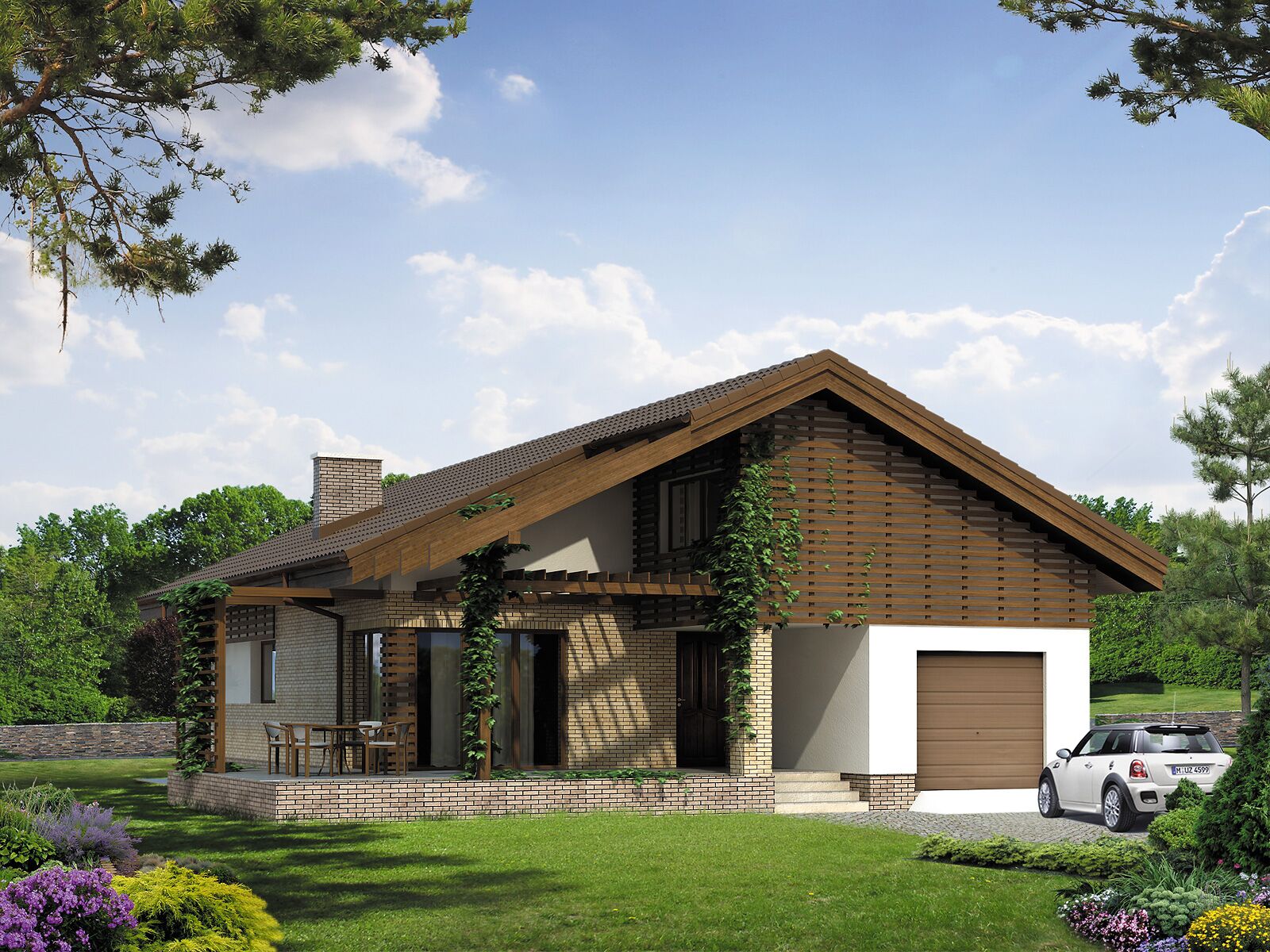 Dom parterowy z użytkowym poddaszem, niepodpiwniczony, dla 4 – 5-osobowej rodziny. Wejście od południa. Praktyczny układ funkcjonalny z wyraźnym podziałem na część dzienną i nocną. Ciekawa, przestronna antresola z możliwością adaptacji np. na bawialnię. Dodatkowy pokój na poddaszu.