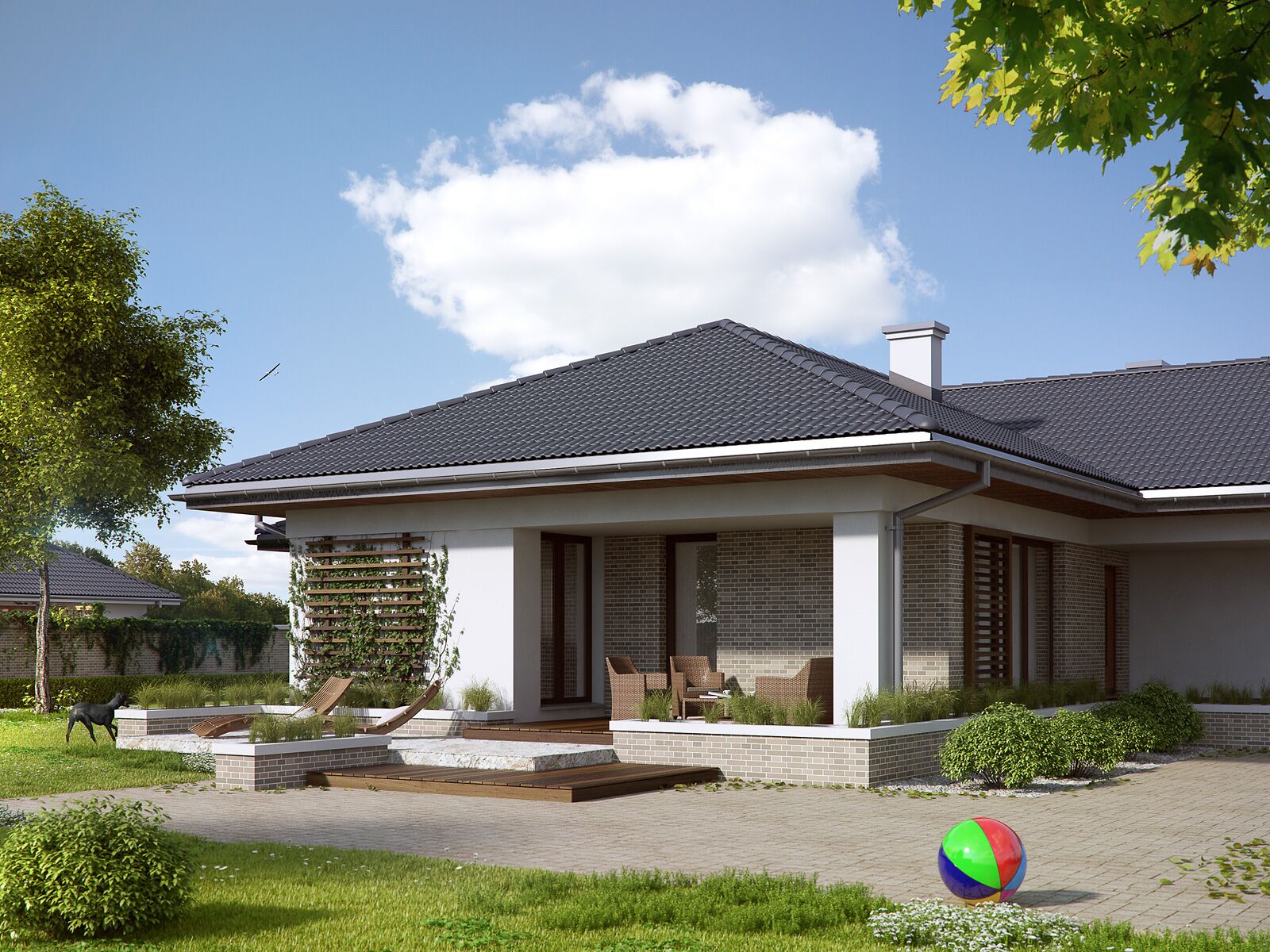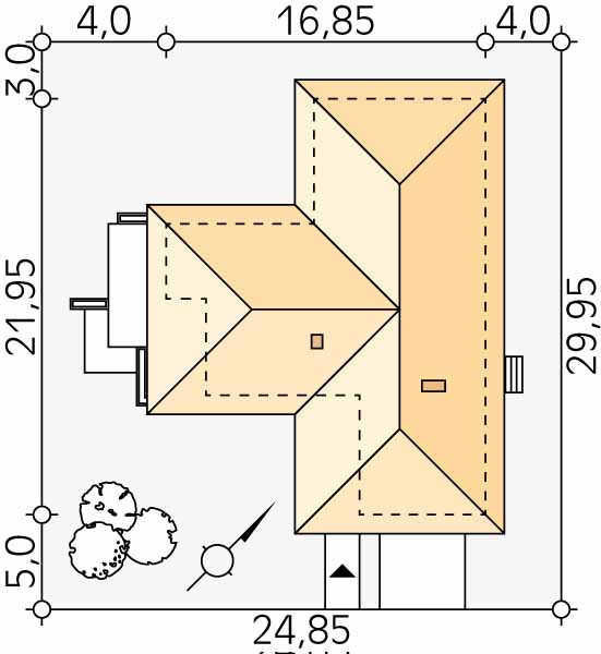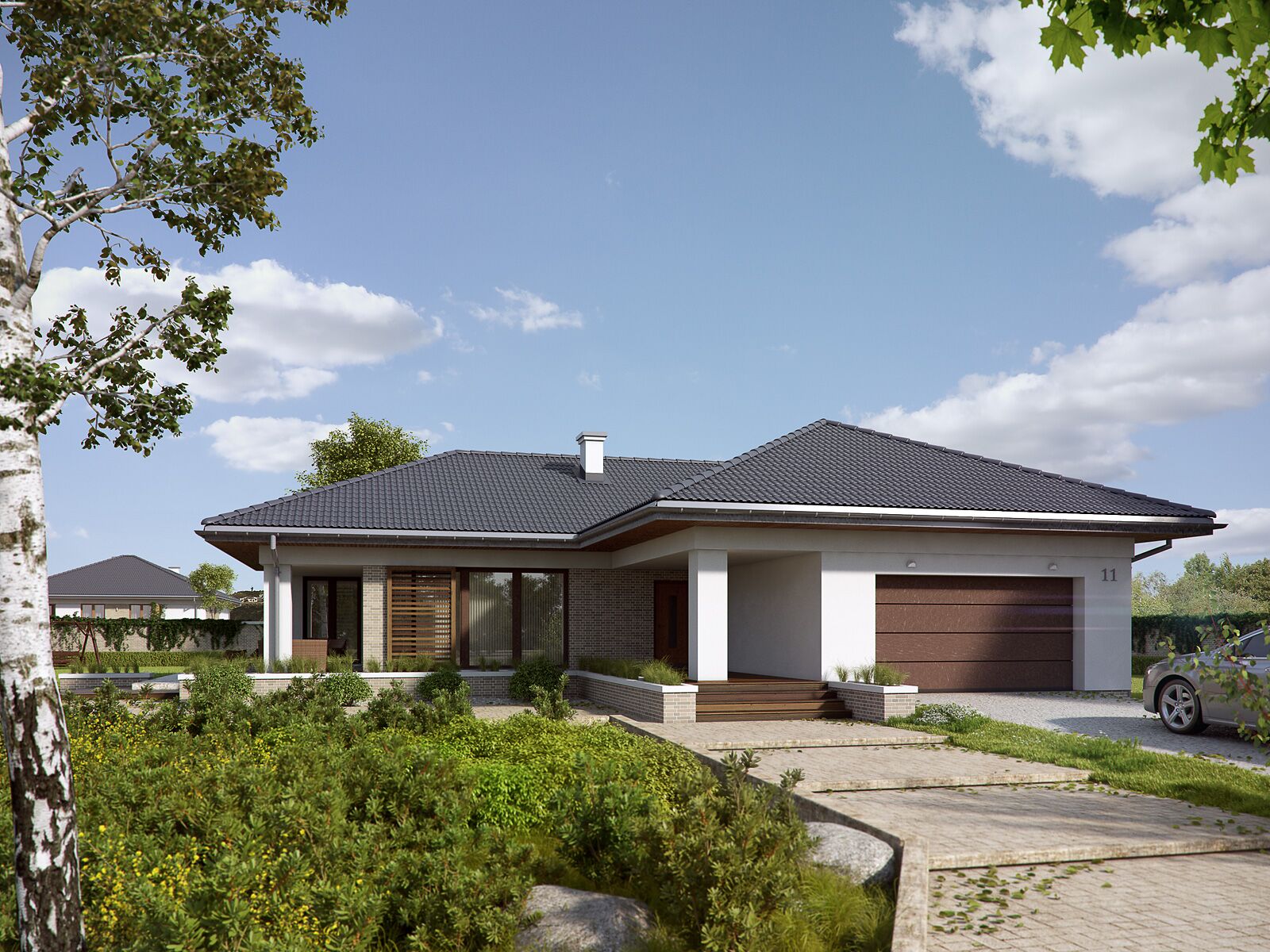 Jednorodzinny budynek mieszkalny, niepodpiwniczony, z wjazdem od południa. Dużym atutem projektu są cztery sypialnie, co umożliwia wygodne funkcjonowanie 5-osobowej rodziny. W części dziennej zaprojektowano salon oraz kuchnię z jadalnią, skąd prowadzi wyjście na zadaszony taras. Część nocną stanowią cztery sypialnie, w tym jedna z własną łazienką i garderobą oraz łazienka. W części gospodarczej przewidziano przestronną kotłownię oraz dwustanowiskowy garaż.