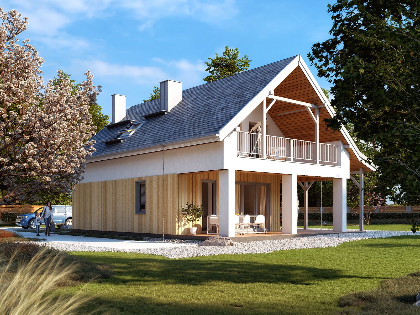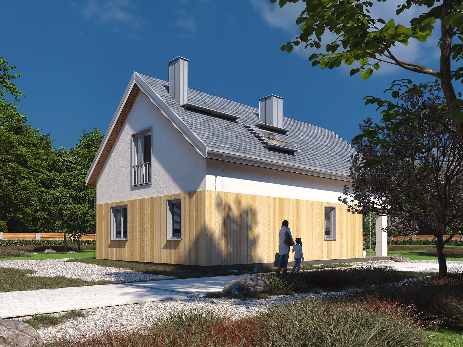 Alikante 2 to projekt domu z użytkowym poddaszem o powierzchni 88 m2. Projekt cechuje zwarta bryła przykryta dwuspadowym dachem. W projekcie zaprojektowano otwartą część dzienną. Tworzą ją salon z kominkiem, niewielka jadalnia oraz kuchnia. Niewątpliwa zaletą części dziennej są duże przeszklenia, które otwierają wnętrze na ogród i wprowadzają naturalne światło. Na poddaszu zaprojektowano trzy sypialnie oraz rodzinną łazienkę. W łazience wygospodarowano miejsce zarówno na wannę, jak i prysznic. Na parterze pojawił się dodatkowy pokój, który idealnie sprawdzi się jako sypialnia dla gości lub gabinet do pracy i nauki.