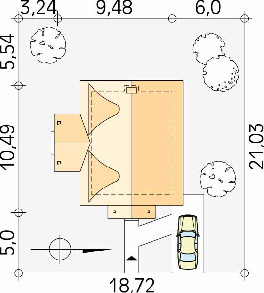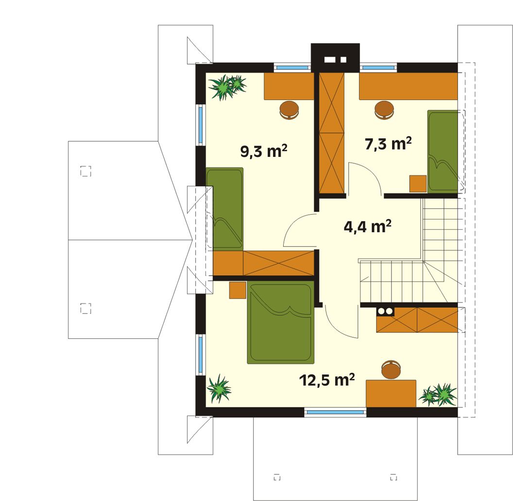 Mały dom mieszkalny, jednorodzinny z powodzeniem może służyć jako całoroczny dom rekreacyjny, przeznaczony dla 2 – 3-osobowej rodziny. Na parterze zaprojektowano otwartą przestrzeń wielofunkcyjną i łazienkę. Na poddaszu znajdują się trzy małe sypialnie.