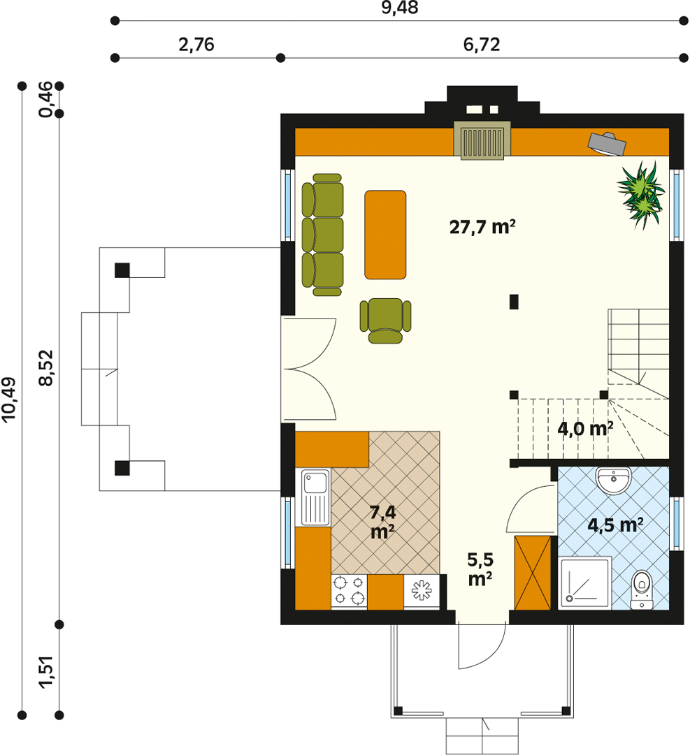 Mały dom mieszkalny, jednorodzinny z powodzeniem może służyć jako całoroczny dom rekreacyjny, przeznaczony dla 2 – 3-osobowej rodziny. Na parterze zaprojektowano otwartą przestrzeń wielofunkcyjną i łazienkę. Na poddaszu znajdują się trzy małe sypialnie.