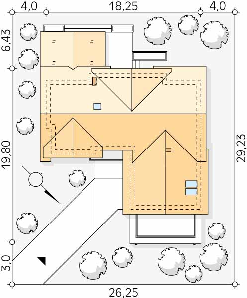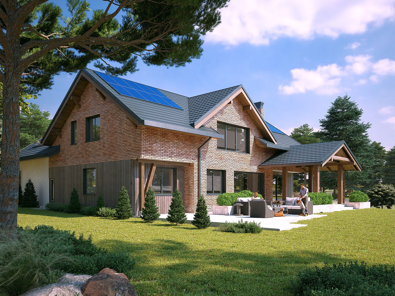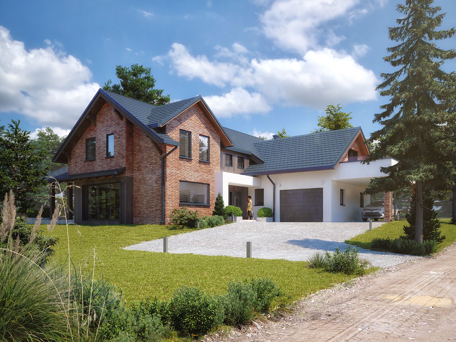 Anyż to nowoczesny projekt domu z poddaszem i jednostanowiskowym garażem. 3Przewidziano tu powierzchnię użytkową 268 m2. 3Projekt posiada ciekawą elewację wykończoną białym tynkiem, drewnianą szalówką i płytkami elewacyjnymi. 3Na parterze zaprojektowano salon, jadalnię oraz kuchnię ze spiżarnią. 3Układ funkcjonalny parteru dopełnia gabinet oraz liczne pomieszczenia użytkowe. 3Na poddaszu znalazły się trzy sypialnie.3 Każda z nich posiada prywatną garderobę. 3Mieszkańcy do dyspozycji mają tu również rodzinną łazienkę oraz pomieszczenie do adaptacji wg własnego uznania.