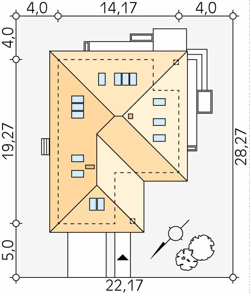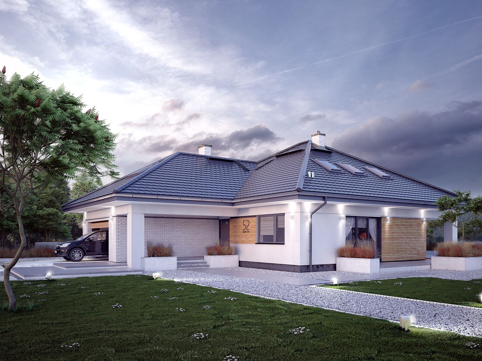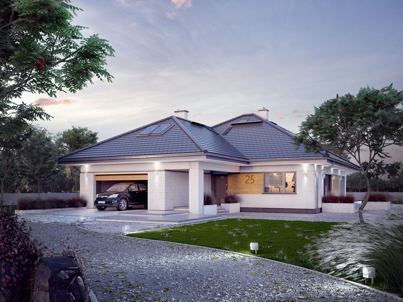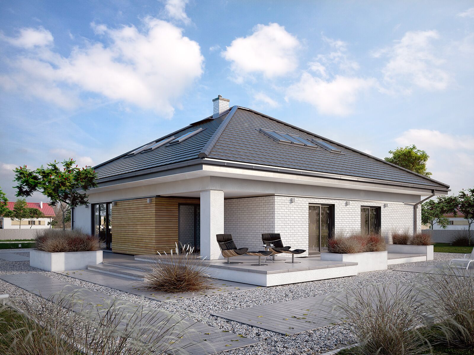 Ariel 7 to propozycja domu z użytkowym poddaszem przeznaczonego dla 6-7 osobowej rodziny. Na parterze zaprojektowano obszerną część dzienną na którą składają się salon z jadalnią oraz kuchnia ze spiżarnią. Na przestrzeni parteru przewidziano również dodatkową sypialnię z dostępem do łazienki i garderoby, gabinet oraz pokój dla gości. Program parteru uzupełnia kotłownia z oddzielnym wejściem oraz dwustanowiskowy garaż. Na poddaszu zaprojektowano 3 sypialnie, łazienkę oraz pralnię. Największa z sypialni posiada własną łazienkę, zaś dwie pozostałe zostały wyposażone w garderoby. Atutem projektu jest częściowo zadaszony taras okalający budynek z dwóch stron.