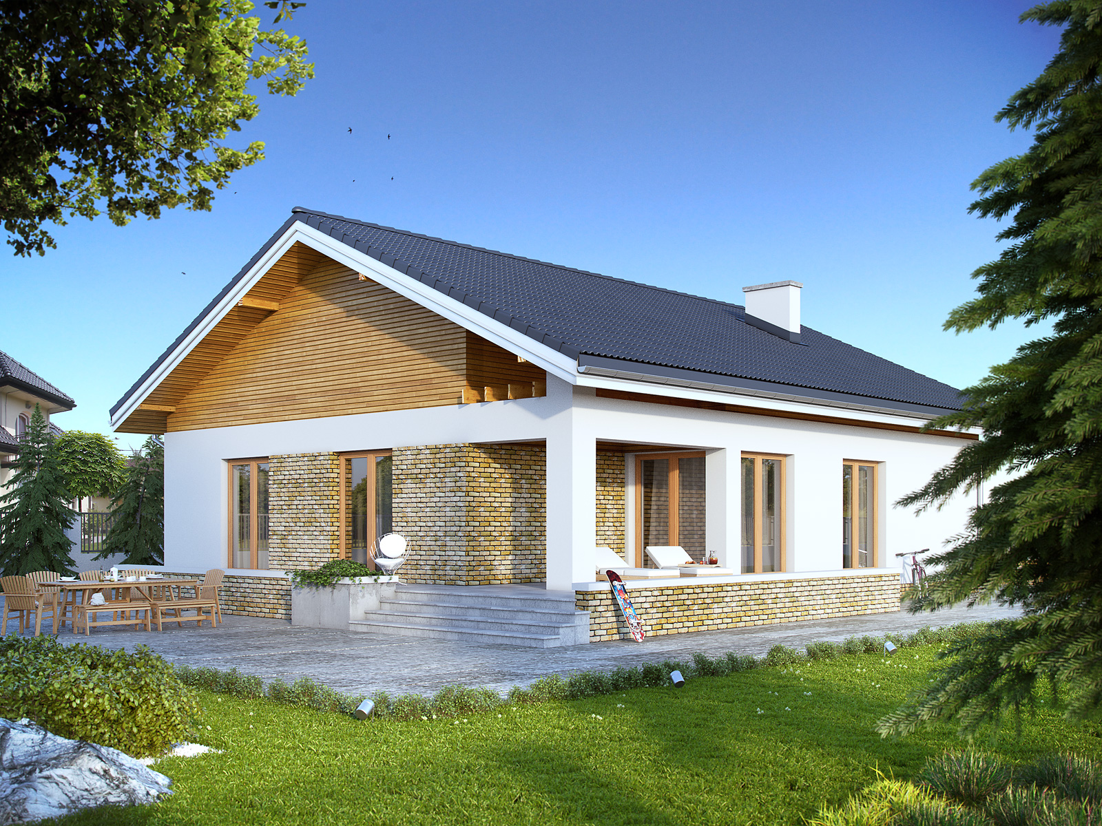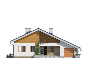 Jednorodzinny dom parterowy z garażem, przeznaczony dla 4-osobowej rodziny. Funkcjonalny układ pomieszczeń z wyraźnym podziałem na część dzienną i nocną. W prostej bryle budynku zaprojektowano przestronny, otwarty salon z kuchnią i jadalnią oraz częściowo zadaszony taras. W części nocnej przewidziano trzy przestronne sypialnie.