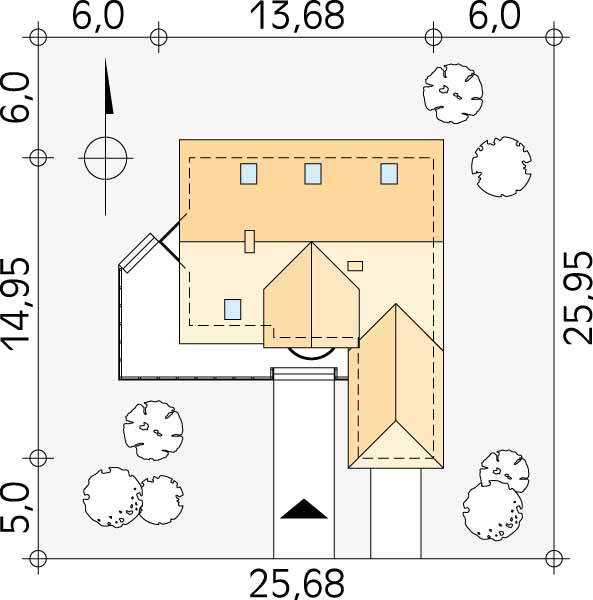 Dom jednorodzinny, parterowy z poddaszem użytkowym i garażem jednostanowiskowym, przeznaczony dla 4 – 5-osobowej rodziny. Budynek odpowiada lokalizacji na działkach z wjazdem od strony południowej. Na parterze zaprojektowano pomieszczenia strefy dziennej z dodatkowym pokojem-gabinetem. Na poddaszu zaprojektowano trzy sypialnie, dwie łazienki, w tym jedną dołączoną do sypialni.