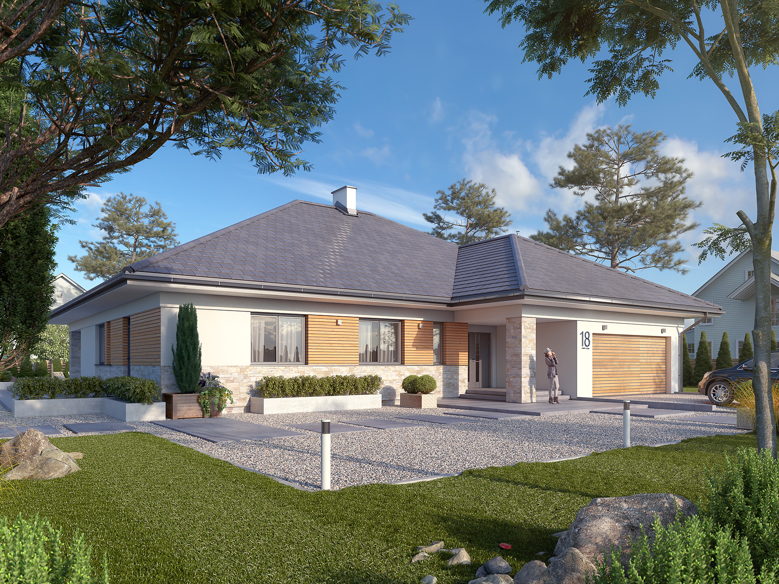 Decyma 14 to parterowy dom z dwoma lokalami mieszkalnymi. W bryle budynku zaprojektowano dwa lokale mieszkalne mogące funkcjonować wspólnie, lub niezależnie od siebie. Główne mieszkanie jest przeznaczone dla nawet 5-osobowej rodziny. W układzie funkcjonalnym wydzielono dwie strefy: prywatną oraz dzienną, składającą się z dużego, reprezentacyjnego salonu i kuchni. W mniejszym mieszkaniu zaprojektowano osobne wejście, dwa pokoje, łazienkę i aneks kuchenny. Od strony ogrodu znajduje się duży taras, z którego można korzystać niezależnie od pogody.