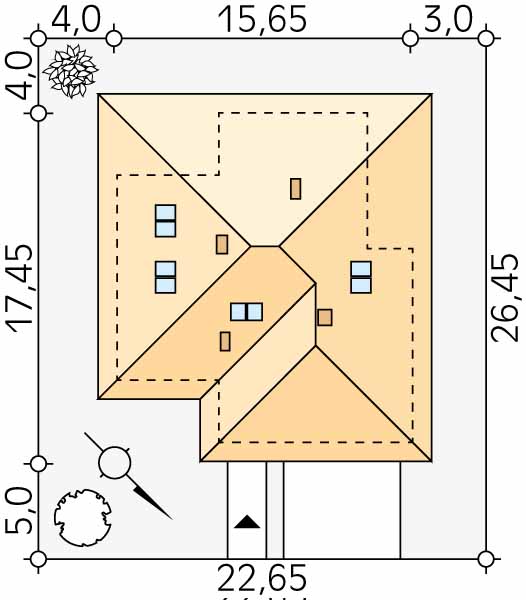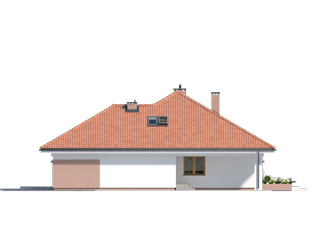 Jednorodzinny budynek mieszkalny, parterowy z użytkowym poddaszem, niepodpiwniczony, przeznaczony dla 4 – 6-osobowej rodziny. W części dziennej przewidziano salon z kominkiem oraz kuchnię z jadalnią. W części nocnej parteru – dwie sypialnie z łazienką, zaś w gospodarczej dwustanowiskowy garaż i kotłownię. Na poddaszu zaprojektowano trzy duże sypialnie i łazienkę. Elewacje budynku są utrzymane w nowoczesnej stylistyce. Rozległe tarasy harmonijnie łączą wnętrza domu z ogrodem.