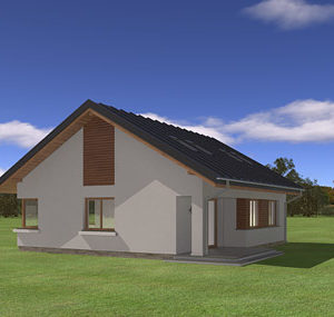 Projekt domu Dom Dla Trojga to nowoczesny, niewielki domek dla 3- 4-osobowej rodziny. Budynek jest parterowy, przekryty dwuspadowym dachem. Na prostokątnym planie parteru zaprojektowano przestronny salon z aneksem jadalnym, połączony z częściowo otwartą kuchnią i holem. Obok mieszczą się dwie sypialnie, łazienka i toaleta, oraz obszerny przedsionek i kotłownia. Z przedsionka schodami dostać się można na strych. W projekcie domu Dom Dla Trojga strych jest nieużytkowy, lecz w łatwy sposób można go zaadaptować na poddasze z dodatkowymi pokojami. Ładne, duże wnętrza pomieszczeń, spora część gospodarcza – to odróżnia Dom dla trojga od innych niewielkich projektów domków. Na zewnątrz wejście domu zaakcentowano podestem w podcieniu, oraz wykuszowym oknem kuchni. Od strony ogrodu zaprojektowano szerokie szklane drzwi z salonu na taras i ogród. Taras jest częściowo zadaszony podcieniem. Dodatki o nowoczesnej stylistyce, jak fragmenty ścian obłożone drewnem, tworzące wraz z oknami podział elewacji na pasy, czy okna narożne – podkreślają nowoczesny a zarazem nie pretensjonalny charakter architektury. Pracownia posiada wersję odbicia lustrzanego projektu domu Dom Dla Trojga.