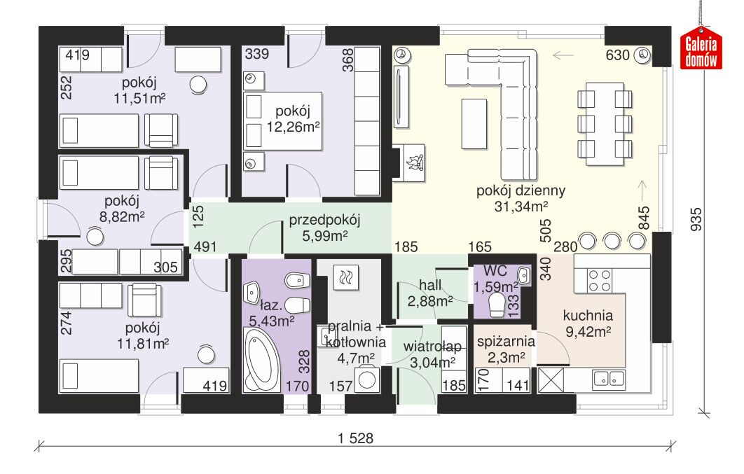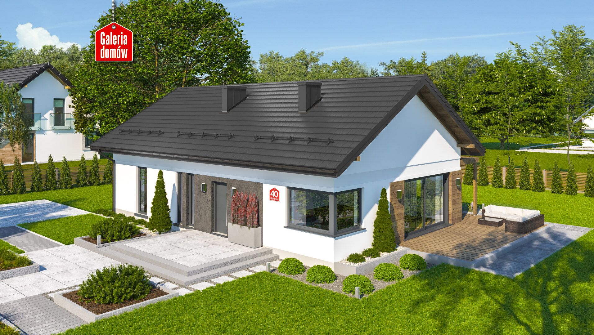 Dom przy Bukowej 40 to budynek jednorodzinny parterowy. Powierzchnia użytkowa 106.39 m². Dom bez garażu, ma zwartą bryłę i prosty dach dwuspadowy. Wnętrze mieści bogaty układ funkcjonalny. Część dzienna to obszerny livingroom, na który składa się otwarta kuchnia i pokój z jadalnią. Salon otwarto na dwie strony, a doskonałą komunikację zapewniają przesuwne drzwi. Komfortowa strefa wypoczynku to aż 4 pokoje. Każda sypialnia ma zaprojektowane drzwi balkonowe, dzięki którym można z pokoju wyjść bezpośrednio do ogrodu. Dom przy Bukowej 40 ma duża łazienką oraz dodatkowa toaletę. Posiada również pomieszczenia dodatkowe, takie jak pralnia z kotłownią oraz spiżarnia. Budynek realizuje się szybko i bez najmniejszych komplikacji. Doskonały wybór dla rodziny 4-6 osobowej.