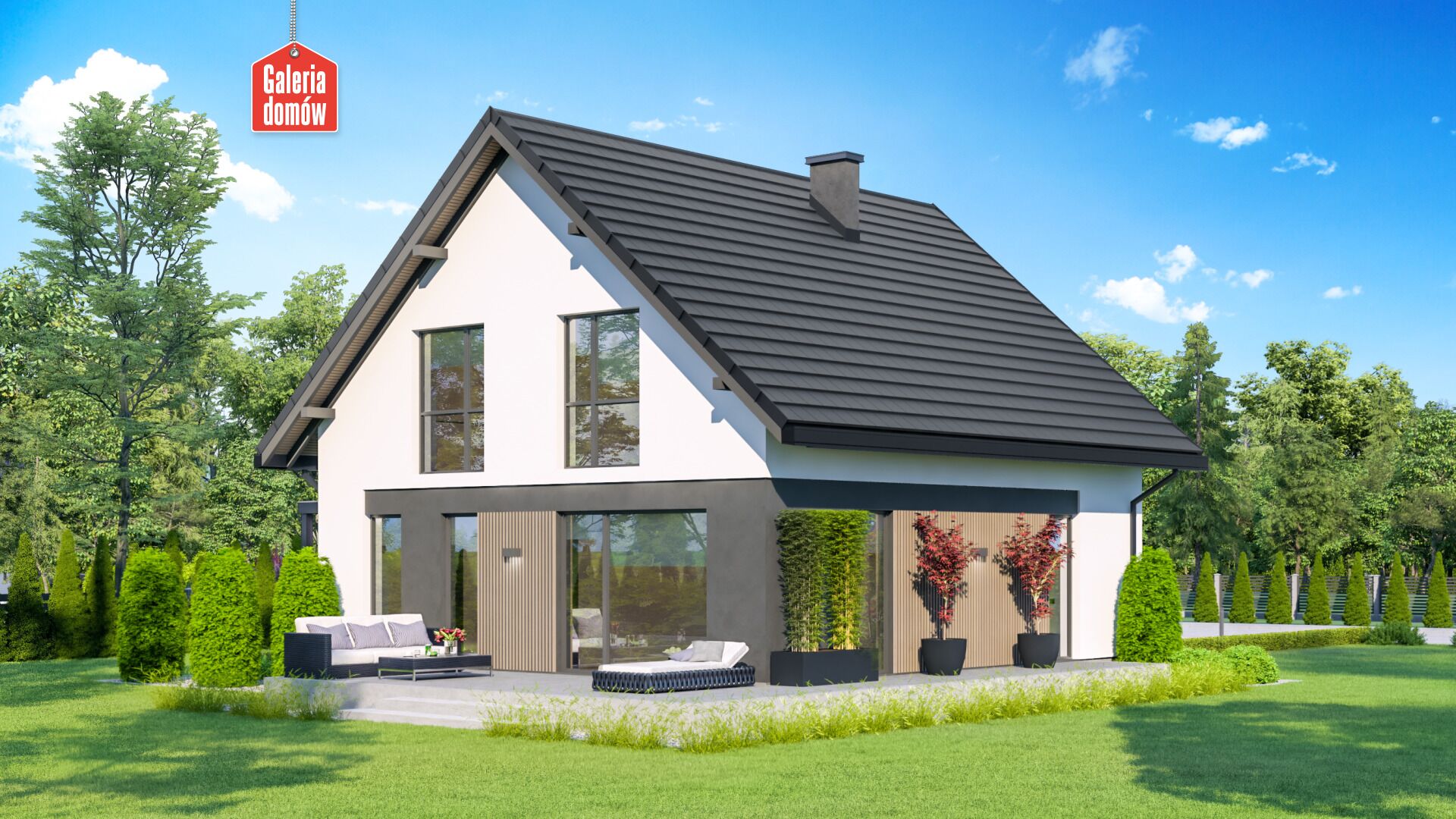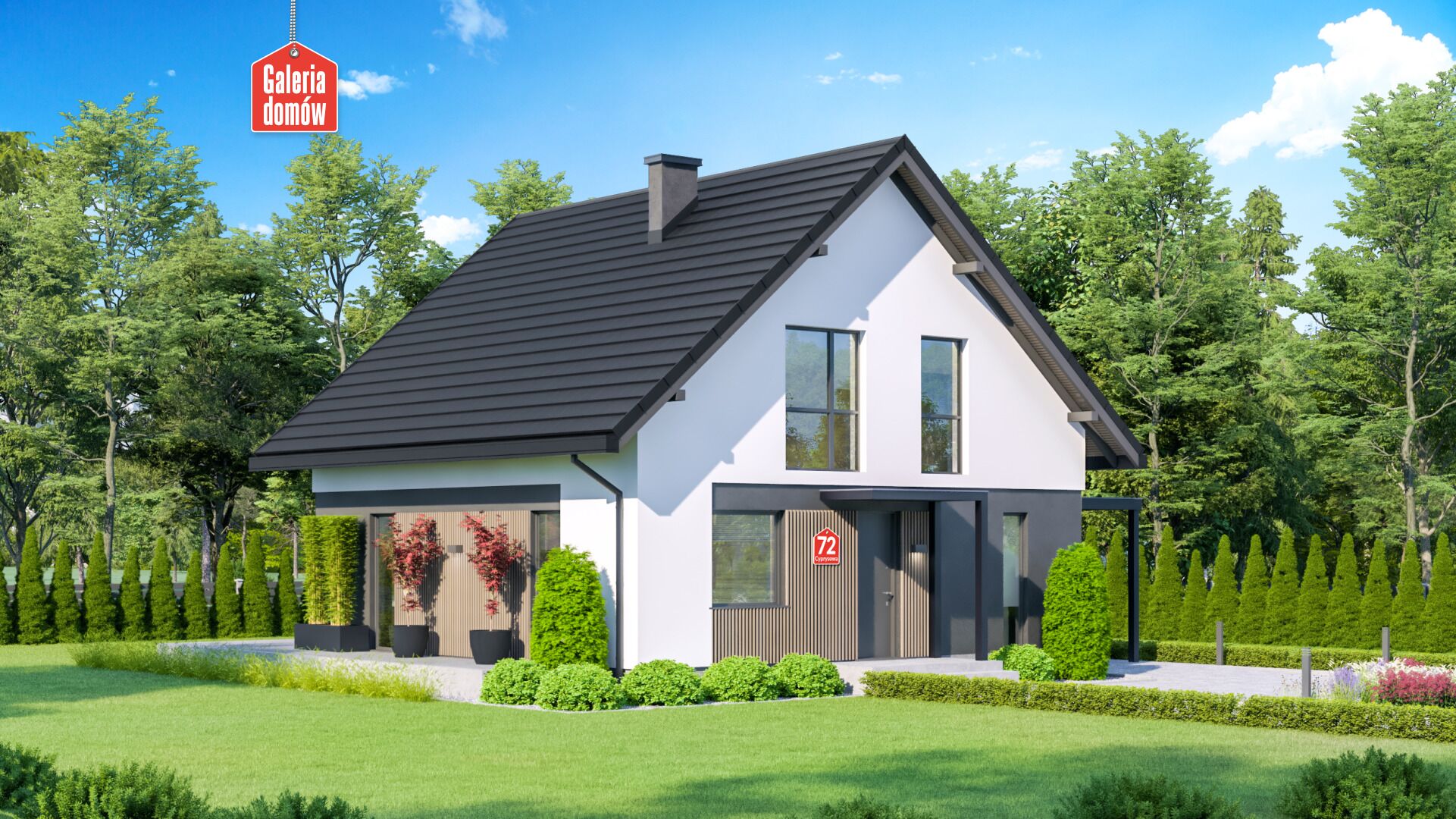 Dom przy Cyprysowej 72 to projekt nowoczesnego domu z poddaszem, o prostej bryle przykrytej dwuspadowym dachem, architekturą nawiązujący do modnych trendów współczesnej architektury jednorodzinnej. Dom z wiatą garażową zamiast tradycyjnego garażu. Liczne przeszklenia, stalowa kolorystyka stolarki, drewniana okładzina dekoracyjna i biała elewacja podkreślają oryginalny charakter domu. Komfort użytkowania zapewnia funkcjonalny podział wnętrza na strefę dzienną i nocną. Na parterze Cyprysowej 72 znajduje się słoneczny salon, z którego przesuwnymi drzwiami można wyjść na taras, duża kuchnia, łazienka i dodatkowy pokój. Na poddaszu zaprojektowano trzy przytulne sypialnie oraz główną łazienkę. Budynek o prostej konstrukcji i niskich kosztach realizacji. Dom został zaprojektowany z myślą o warunkach, jakie powinny w przyszłości spełniać projekty domów zeroemisyjnych.