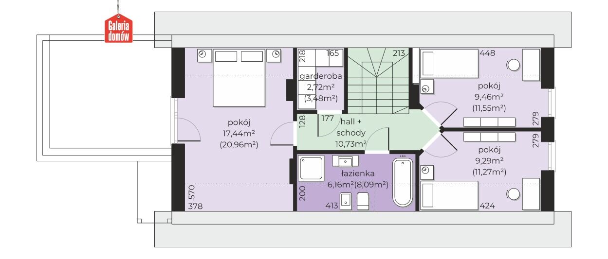 Poddasze mieści 3 pokoje, główną łazienkę oraz garderobę. Każdy pokój ma dostęp do balkonów w stylu francuskim – okna dzielone na część stałą i rozwieraną. Sypialnia małżeńska wychodzi na okazały taras.