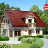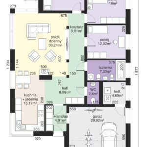 Szerokość działki często jest przeszkodą w lokalizacji domu parterowego. Nie w tym przypadku. Wydłużony kształt budynku nie oznacza, że pomieszczenia zostały zmniejszone. Dom kryje w sobie obszerne wnętrza o regularnych kształtach. Duże przeszklenia doświetlają pomieszczenia. Pokój dzienny, kuchnia, jadalnia, hall i korytarz tworzą wygodny jednoprzestrzenny układ. Dwustanowiskowy garaż, zlokalizowany we frontowej części domu, wysunięty jest mocno poza zasadniczy obrys budynku. Wraz z podłużnym oknem kuchni podkreśla jego horyzontalny, niepowtarzalny styl.