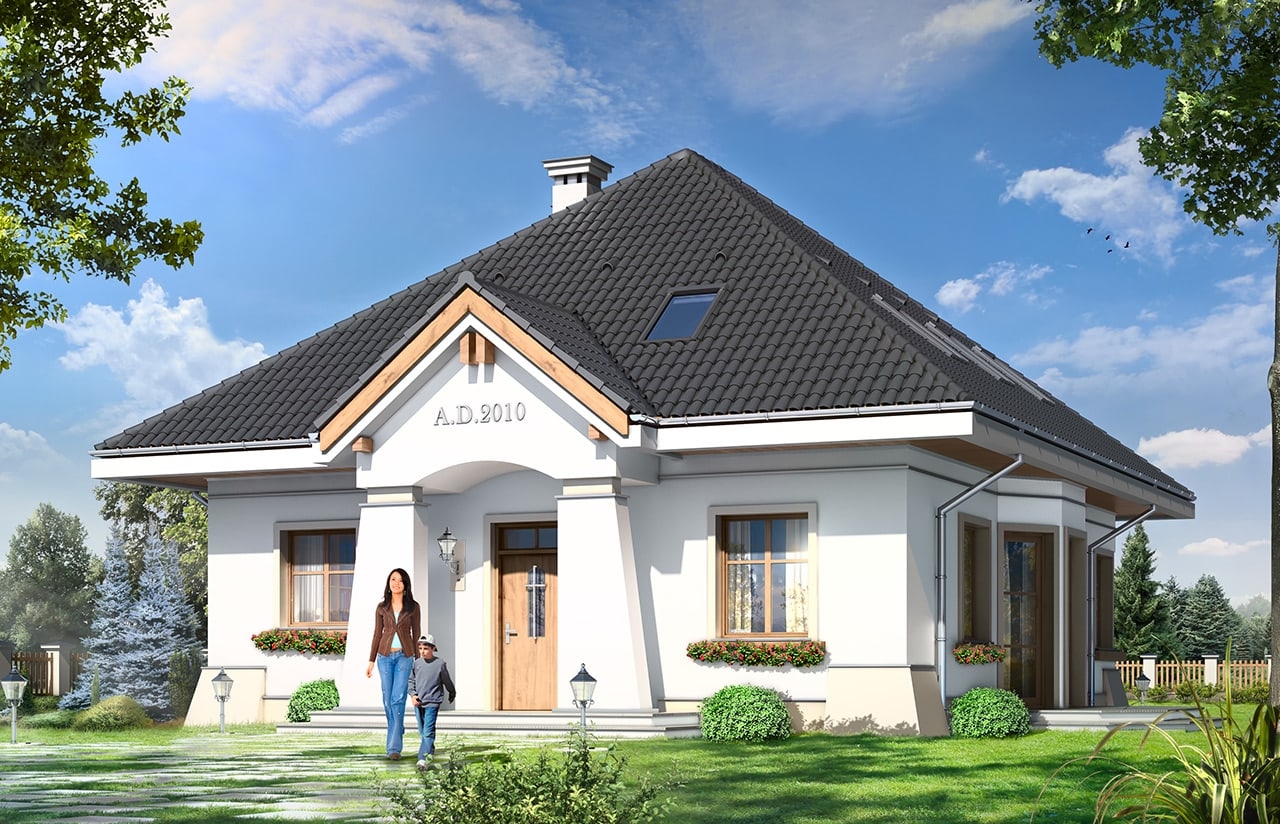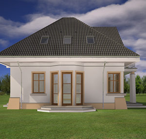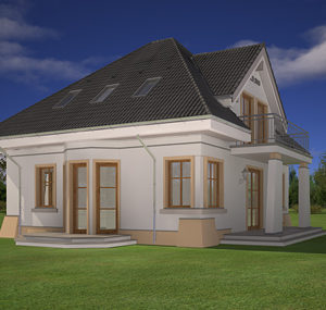 Projekt domu Figiel to budynek jednorodzinny dla 4- 5-osobowej rodziny. Budynek parterowy z poddaszem użytkowym zaprojektowany został na planie prostokąta. Dom Figiel przekryty jest czterospadowym dachem, z dodatkowymi lukarnami od strony elewacji frontowej i ogrodowej. Projekt domu Figiel architektonicznie nawiązuje stylistyką do przedwojennych willi. Łącząc historyczny detal w elewacjach z nowoczesnymi materiałami i rozwiązaniami budowlanymi uzyskano niepowtarzalny styl. Ganek wejściowy z przyporowymi kolumnami, przypory w narożnikach i pasy podmurówki, balkon w elewacji ogrodowej na przyporowych kolumnach – wszystkie te elementy potęgują efekt wrośnięcia się domu w otoczenie. Dzięki temu budynek wygląda bardzo solidnie. Wnętrze Figla podzielono na część dzienną na parterze i sypialnie na poddaszu. Na parterze znajdują się: salon z aneksem jadalnym z pięknym wykuszem, oraz centralnie ustawionym kominkiem, hol – z ładnymi dwubiegowymi schodami, częściowo otwarta kuchnia, oraz dodatkowy pokój, mogący służyć jako gabinet lub sypialnia. Dodatkowo obok przedsionka znajdują się: obszerne pomieszczenie gospodarcze – kotłownia i wc z natryskiem. Na poddaszu zaprojektowano trzy sypialnie z jedną dużą wspólną łazienką, oraz dodatkową garderobę. Pracownia dysponuje odbiciem lustrzanym projektu domu Figiel oraz wersją projekt domu Figiel2. Zapraszamy!