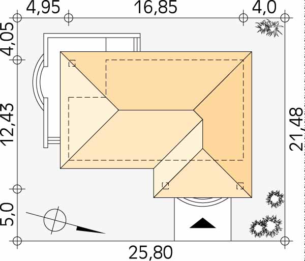 Parterowy budynek mieszkalny przeznaczony dla 3 osób. Na parterze, prócz części dziennej i sypialni, została zaprojektowana spiżarnia, spora kotłownia oraz wc z pralnią. Domek ma duże tarasy z zadaszeniem, umożliwiające korzystanie z nich nawet w kiepską pogodę.
