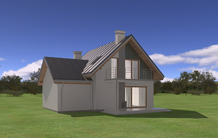 Projekt domu Gucio 2 to nowoczesny niewielki domek dla 4- 5-osobowej rodziny. Parterowy budynek przekryty dwuspadowymi dachami, z dobudowanym do głównej bryły garażem. Dom zaprojektowano, aby dać jak największy komfort przyszłym mieszkańcom, tworząc otwartą przestrzeń dzienną, charakterystyczną dla dużych domów jednorodzinnych. Salon połączony z holem, aneksem jadalnym z wykuszem, wyeksponowanymi reprezentacyjnymi schodami będzie wspaniałym miejscem do życia dla przyszłych domowników. Kominek w domu Gucio 2 usytuowany został na ścianie zewnętrznej, co pozwoli rozkoszować się widokiem ognia i ogrodu równocześnie. Duże przeszklone drzwi łączą pokój dzienny z częściowo zadaszonym tarasem. Na parterze znajduje się też wygodna kuchnia, przedsionek, kotłownia, wc z natryskiem i garaż. Na poddaszu zaprojektowano trzy wygodne sypialnie z niewielkimi „skosami”, oraz z wbudowanymi szafami – garderobami. Dodatkowo na poddaszu znajduje się ładna łazienka. Nad garażem mieści się strych gospodarczy dostępny z garażu. Architektura domu podkreśla prostotę form, nowoczesność w doborze materiałów, co wszystko razem tworzy udaną kompozycję. Dom jest łatwy w budowie i niedrogi w późniejszym utrzymaniu. Projekt domu Gucio 2 dostępny jest także w wersji odbicia lustrzanego oraz w wersji bez garażu projekt domu Gucio.