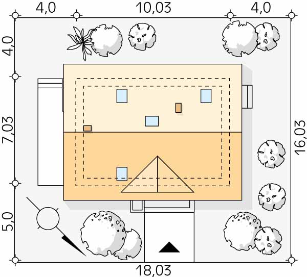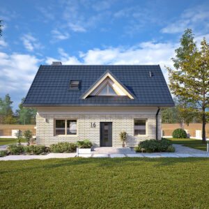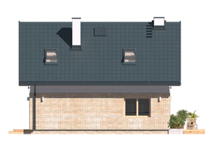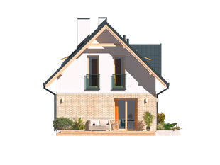 GUCIO to projekt projekt domu z poddaszem użytkowym o powierzchni 77 m2. Jest to dom z poddaszem użytkowym oraz dachem dwuspadowym o kącie 45% oferującym dużą ilość przestrzeni użytkowej. Cechuje się prostą bryłą oraz nowoczesnym wykończeniem elewacji. Przestrzeń salonu połączono z jadalnią i wyjściem na taras. Na piętrze znajdują się trzy pokoje z wysokimi przeszkleniami. Prostota domu zmniejsza koszty i przyśpiesza czas budowy.
