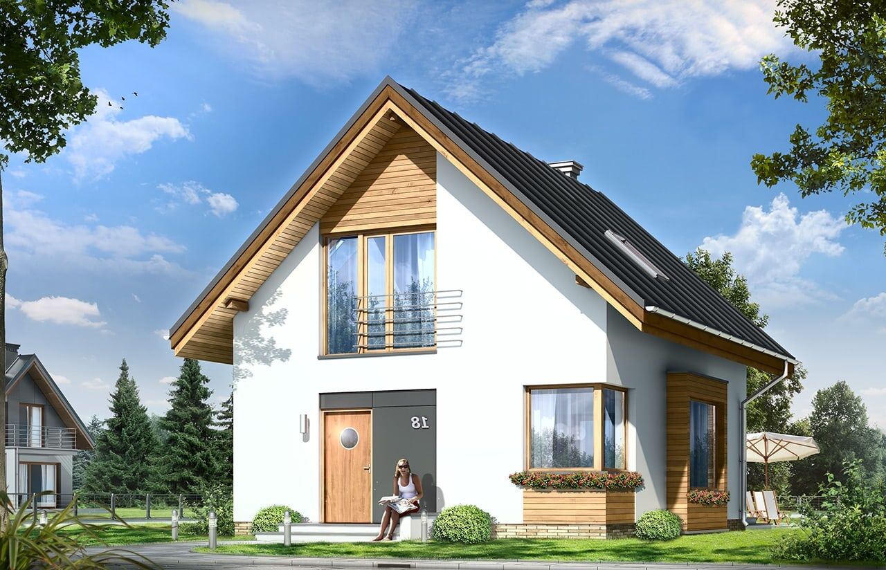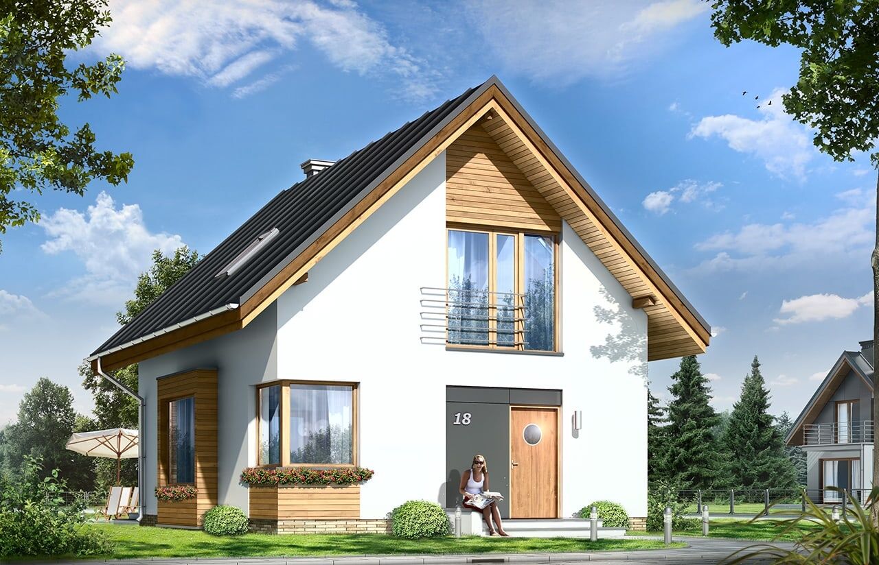 Projekt domu Gucio to parterowy domek jednorodzinny z poddaszem użytkowym dla rodziny 4- 5-osobowej. Zaprojektowany został na planie prostokąta i przekryty symetrycznym dwuspadowym dachem. Prosta bryła budynku w połączeniu z nowoczesnym detalem i materiałami daje atrakcyjny wygląd zewnętrzny domu. Fragmenty elewacji obłożone drewnem, czy płytami HPL dodatkowo urozmaicają białe powierzchnie ścian. Wewnątrz domu Gucio, na parterze zaprojektowano jednoprzestrzenną część dzienną, z połączonym salonem, holem, aneksem jadalnym z wykuszem, wyeksponowanymi reprezentacyjnymi schodami. Kominek usytuowany na ścianie zewnętrznej można podziwiać wraz z widokiem na ogród jednocześnie. Duże przeszklone drzwi prowadzą z salonu na częściowo zadaszony taras. Na poddaszu, oprócz sporej łazienki, zaprojektowano trzy wygodne sypialnie z niedużymi „skosami” i wbudowanymi szafami-garderobami. Pracownia posiada także projekt domu Gucio w wersji odbicia lustrzanego oraz w wersji wariantowej projekt domu Gucio 2.