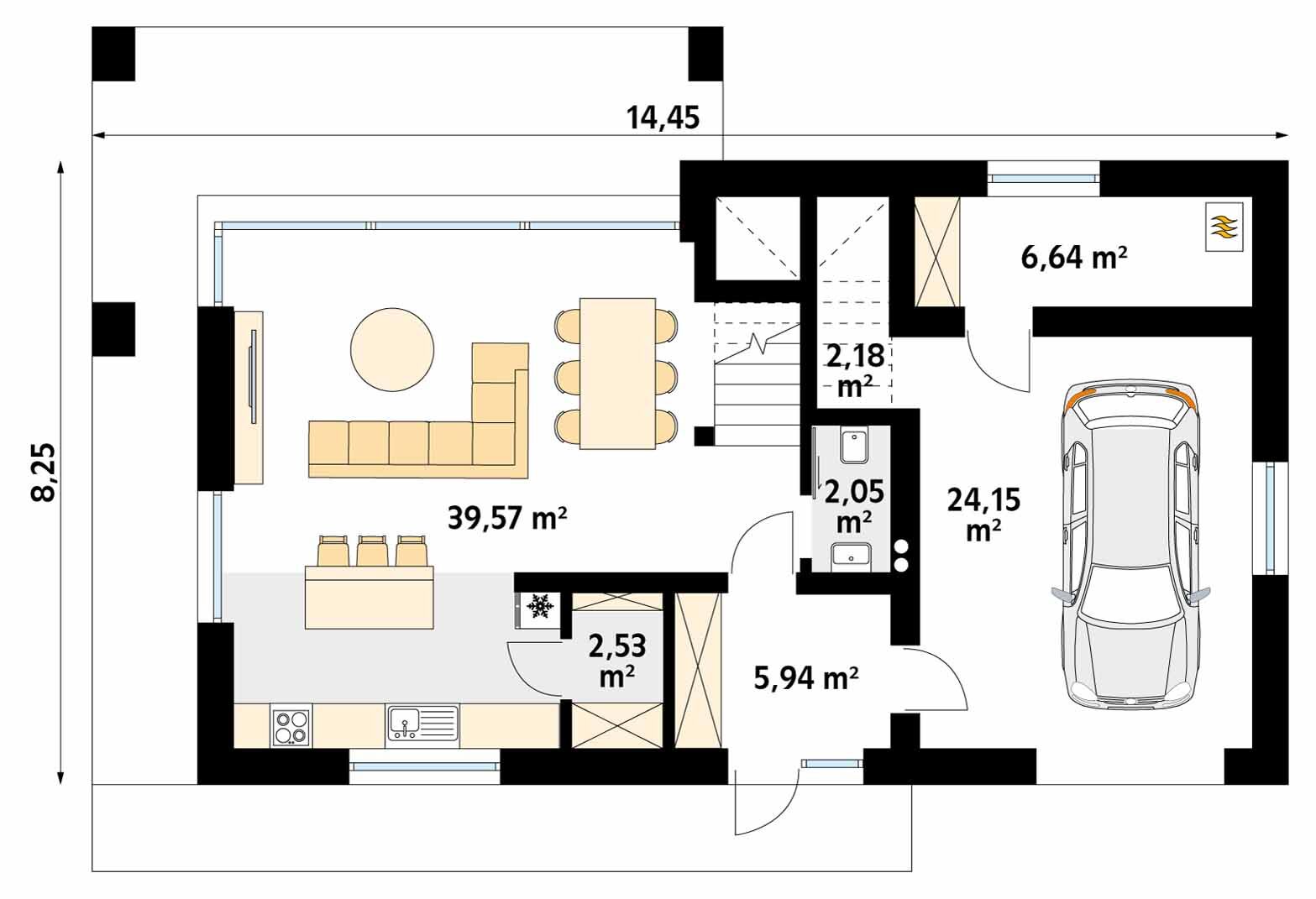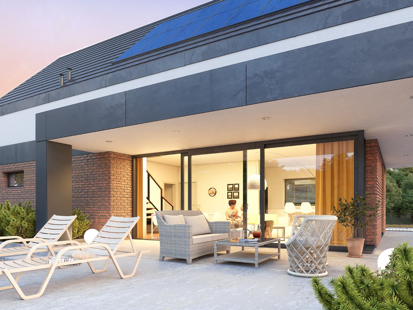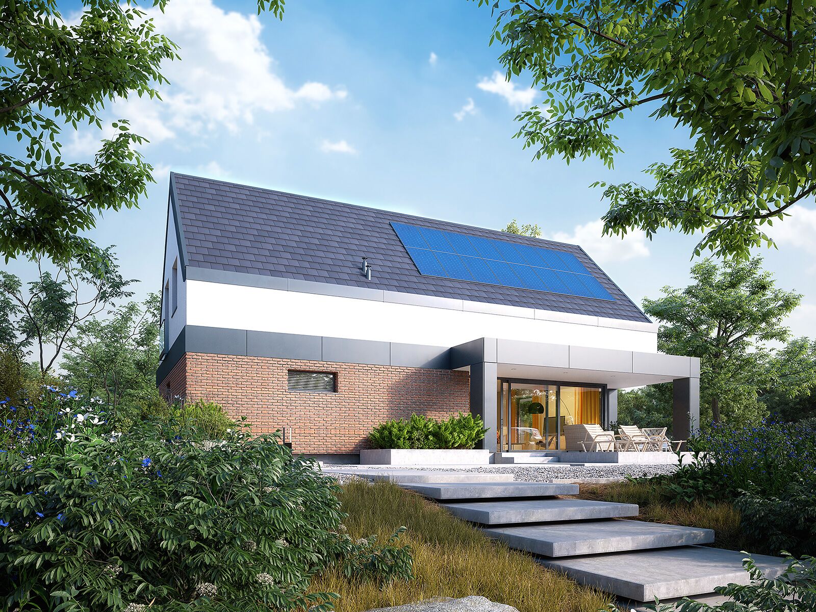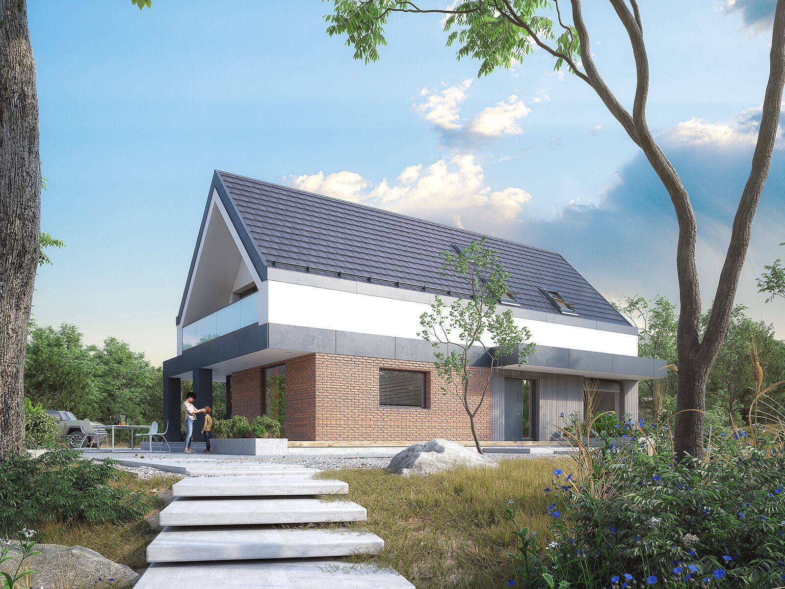 Iko to projekt domu z użytkowym poddaszem o powierzchni ok. 130 m2. Dzięki zastosowaniu nowoczesnych elementów architektonicznych dom prezentuje się niezwykle oryginalnie. Na elewacji wykorzystano płytkę elewacyjną w kolorze ceglastym oraz drewnianą szalówkę w odcieniu szarości. Układ funkcjonalny domu został przemyślany w każdym szczególe. Otwarta część dzienna to salon, jadalnia oraz kuchnia, przy której pojawiła się spiżarnia. W kuchni przewidziano wyspę kuchenną przy której pojawiły się wysokie hokery. Układ funkcjonalny parteru dopełnia garaż oraz kotłownia z miejscem na pompę ciepła. Na poddaszu zaprojektowano cztery funkcjonalne sypialnie oraz ogólnodostępną łazienkę. Autor projektu wygospodarował również miejsce na pralnię.