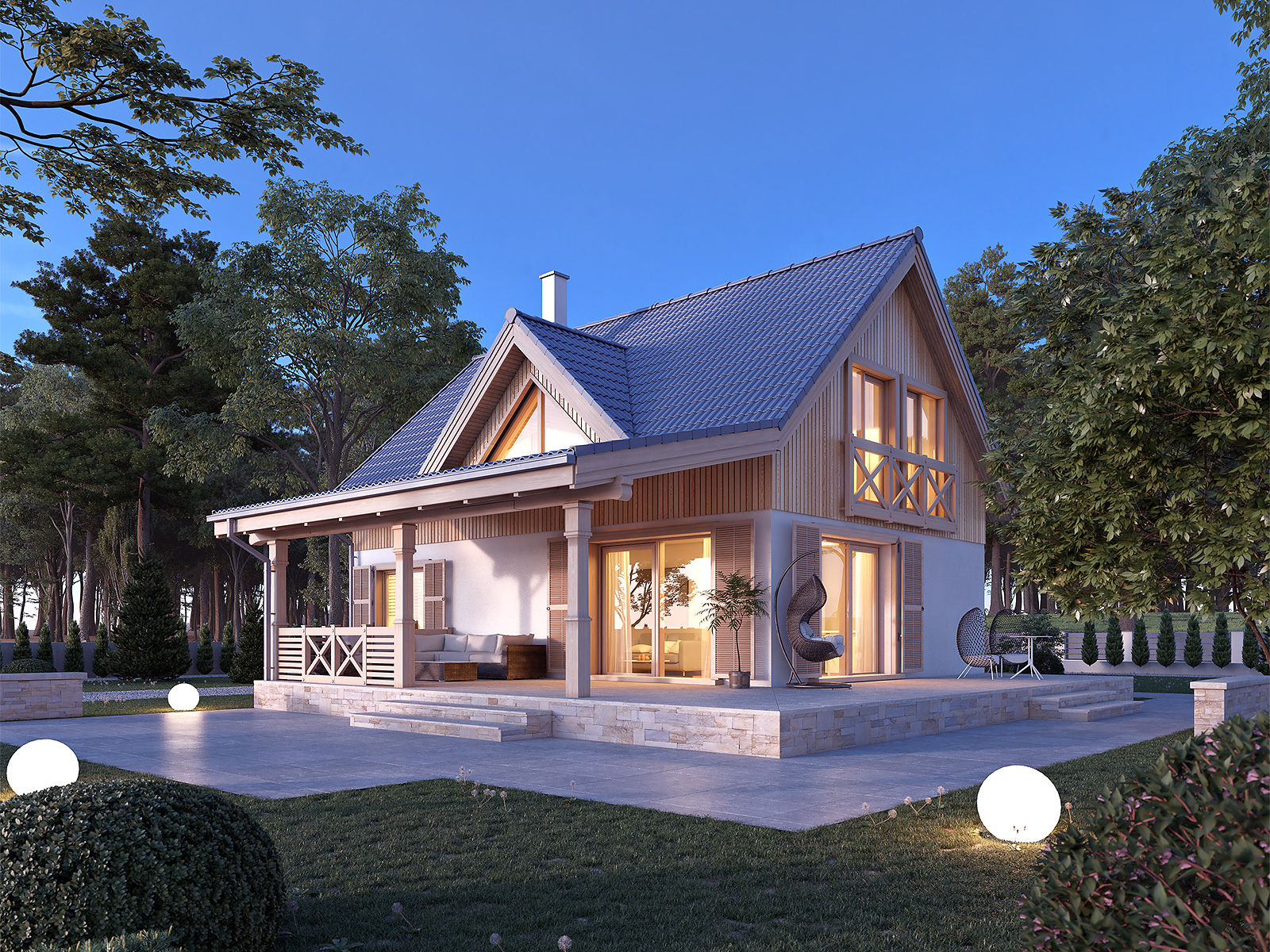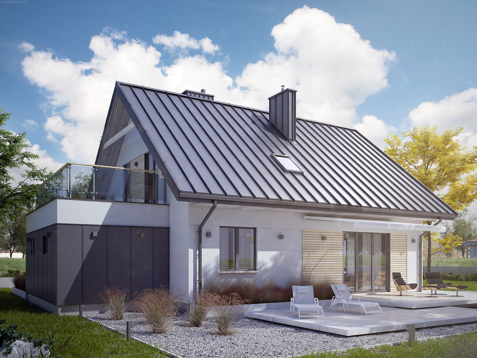 Niewielki, ale wygodny dom dla 4 – 5-osobowej rodziny. Zlokalizowana na parterze część dzienna mieści w sobie przestronny pokój dzienny z jadalnią, kuchnię, spiżarnię i gabinet. Znajduje się tam też duża kotłownia oraz wc. Na poddaszu są trzy sypialnie, łazienka i garderoba. Dom ten posiada garaż nad którym znajduje się taras dostępny z sypialni i łazienki. Prosta bryła z dwuspadowym dachem czyni dom łatwym w realizacji i tanim w użytkowaniu.