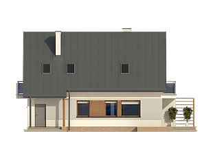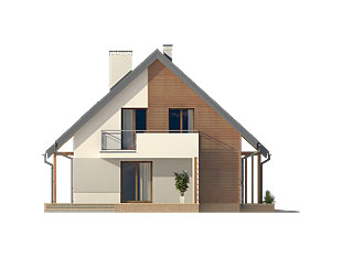 Niewielki ale wygodny dom dla 4 – 5-osobowej rodziny. Zlokalizowana na parterze część dzienna mieści w sobie przestronny pokój dzienny, jadalnię, kuchnię ze spiżarnią i gabinet, dodatkowo są tu: łazienka, duża kotłownia i jednostanowiskowy garaż. Na poddaszu znajdują się trzy obszerne sypialnie z wyjściami na dwa balkony, łazienka i garderoba. Prosta bryła z dwuspadowym dachem czyni dom łatwym w realizacji i tanim w użytkowaniu.