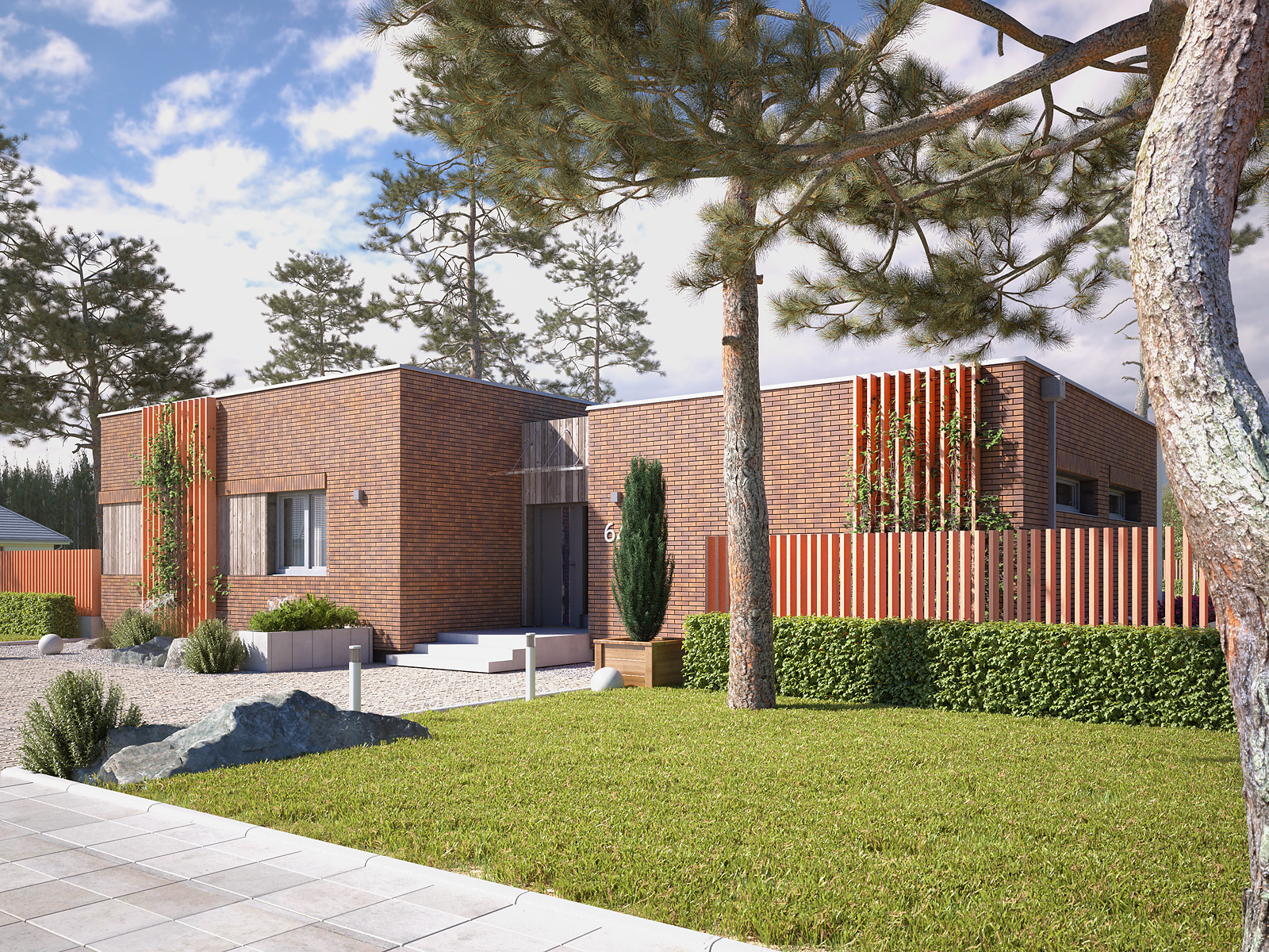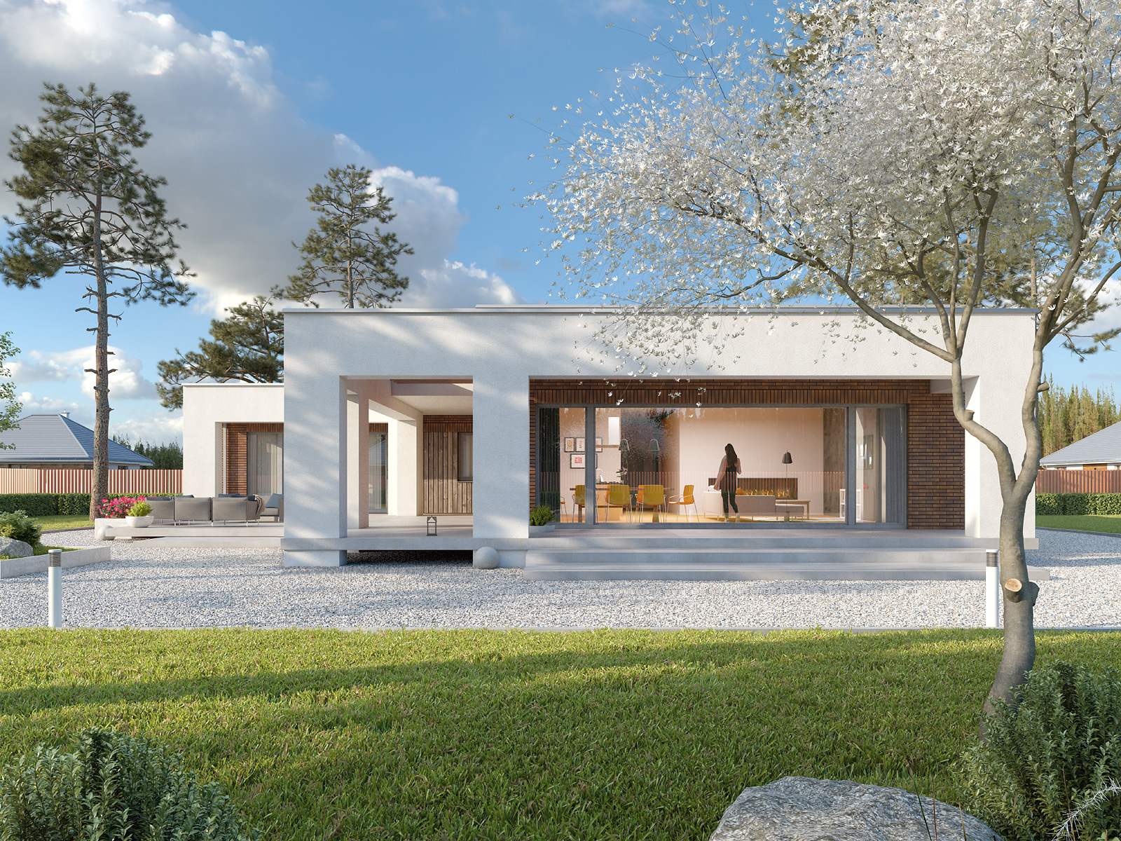 Jadeit 2 to projekt domu parterowego, zaprojektowany z myślą o oryginalnej bryle oraz ciekawych rozwiązaniach elewacyjnych. Projekt podzielono na trzy strefy użytkowe. Strefę dzienną tworzy salon z kuchnią i jadalnią, który jest otwarty na ogród poprzez duże przeszklenie. Strefa nocna to cztery sypialnie, z czego jedna to apartament gospodarzy z przestronną łazienką z widokiem na ogród. Dodatkowo na parterze znajduje się ogólnodostępna łazienka oraz kotłownia.