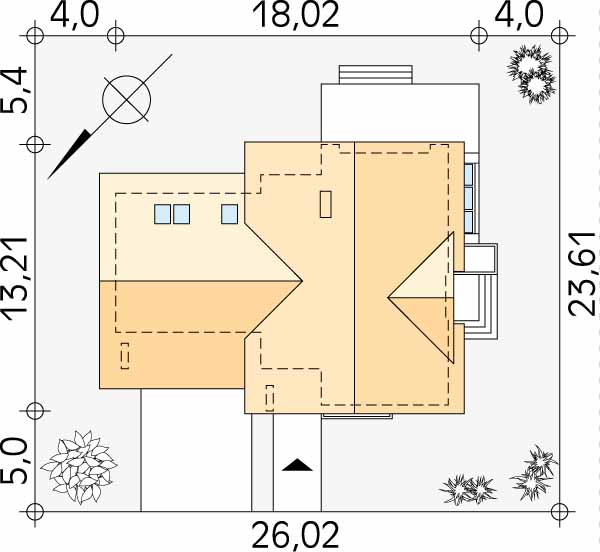 Nowoczesny dom mieszkalny projektowany według standardów przyjętych w domach energooszczędnych. W dużych przestronnych wnętrzach parteru zaprojektowano oranżerię. Na poddaszu zaprojektowano trzy sypialnie oraz pokój zabaw lub hobby nad garażem.
