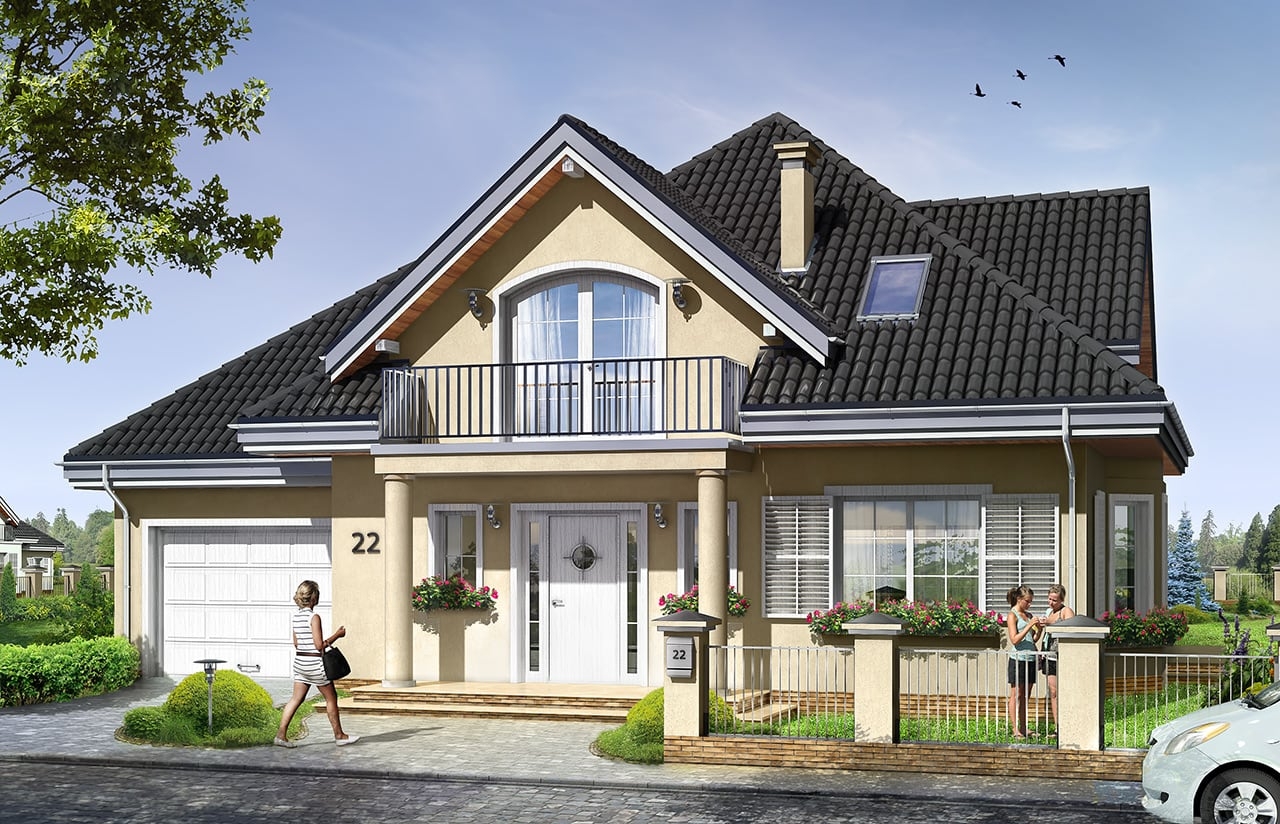 Projekt domu Julka 2 to pomniejszony wariant projektu Julka – z pojedynczym garażem i mniejszym strychem nad garażem. Domek stanowi idealną propozycję dla 4- 5-osobowej rodziny, która marzy o własnych czterech ścianach. Projekt domu Julka 2 stworzono na planie kwadratu, z dobudowanym garażem. Parter i poddasze wieńczy kopertowy dach, którego urozmaiceniem są lukarny z balkonami. Architektura zewnętrzna domu to tradycyjny Polski „dachowiec”, z ciekawie dobranymi oknami i drzwiami balkonowymi, z ozdobnymi wykuszami i podcieniem ogrodowym, umożliwiającym przebywanie na tarasie w niepogodę. Wejście do domu Julka 2 zaakcentowano dwiema kolumnami, na których wspiera się balkonik frontowej lukarny. Wewnątrz dom zaprojektowano z podziałem na część dzienną na parterze i na część nocną – intymną z sypialniami na poddaszu. Większość powierzchni parteru zajmuje przestronna – jak na tą skalę domu – część dzienna z salonem, jadalnią, holem i półotwartą kuchnią. Schody stanowią dekoracyjny element wnętrza. Pozostała przestrzeń to garaż i pomieszczenia gospodarcze. Istnieje możliwość zagospodarowania pomieszczenia przy wejściu na pokój – gabinet lub biuro (likwidując połączenie z garażem). Na poddaszu miejsce znalazły trzy wygodne sypialnie – każda z własną szeroką lukarną, oraz łazienka. Dodatkowo można zaadaptować strych na dodatkowy pokój. Pracownia dysponuje wariantem odbicia lustrzanego projektu Julka 2 oraz kilkoma wariantami : podstawowa (projekt domu Julka), z dachem dwuspadowym i garażem dwustanowiskowym (projekt domu Julka 3), z garażem jednostanowiskowym (projekt domu Julka 4).
