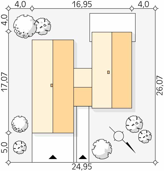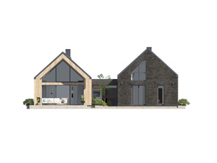Katamaran to nowoczesny projekt domu z użytkowym poddaszem wyróżniający się swoją formą. Projekt tworzą dwie nowoczesne bryły połączone łącznikiem. Część dzienna usytuowana została w bryle parterowej. Zaprojektowano tu otwartą przestrzeń z salonem, jadalnią oraz kuchnią. W salonie pojawiły się panoramiczne przeszklenia, które otwierają wnętrze na ogród i wprowadzają dużo światła. Kuchnia posiada wyspę kuchenną oraz spiżarnię, które z całą pewnością doceni niejedna Pani domu. Niewątpliwą zaletą będzie dwustronny kominek, dostępny zarówno z salonu, jak i kuchni. Część prywatna została podzielona pomiędzy dwie kondygnacje. Zaprojektowano tu trzy wygodne sypialnie, dwie na poddaszu i jedną na parterze. Sypialnia rodziców tworzy tzw. apartament gospodarzy, a więc posiada prywatna łazienkę i garderobę.
