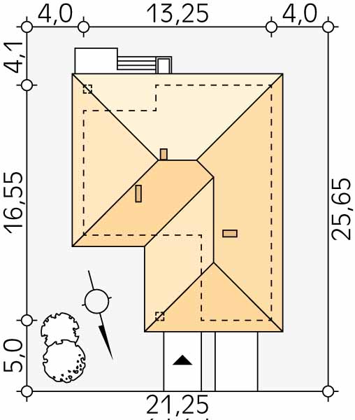 Jednorodzinny budynek mieszkalny, parterowy, niepodpiwniczony. Optymalny układ pomieszczeń zapewnia komfort 4-osobowej rodzinie. W części dziennej domu zaprojektowano kuchnię z jadalnią oraz salon otwierający się na zewnątrz poprzez szereg przeszkleń. Część nocna to trzy sypialnie oraz łazienka. W części gospodarczej przewidziano kotłownię oraz jednostanowiskowy garaż.