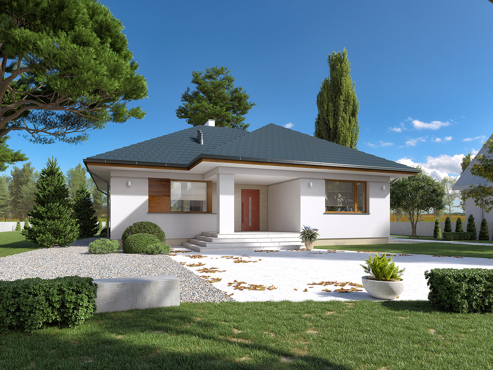 Niewielki dom jednorodzinny z garażem, idealny na wąską działkę. Dom o nowoczesnym i oryginalnym wyrazie. Odznacza się optymalnym wykorzystaniem przestrzeni. Na parterze zaprojektowano przestronny salon, jadalnię, kuchnię oraz garaż i dużą kotłownię. Na poddaszu znajdują się trzy sypialnie, łazienka i garderoba. Projekt mieści się na działce o szerokości poniżej 16 m w związku z tym, zgodnie z przepisami zawartymi w warunkach technicznych, istnieje możliwość przesunięcia domu ścianą bez otworów okiennych na odległość 1,5 m od granicy działki.