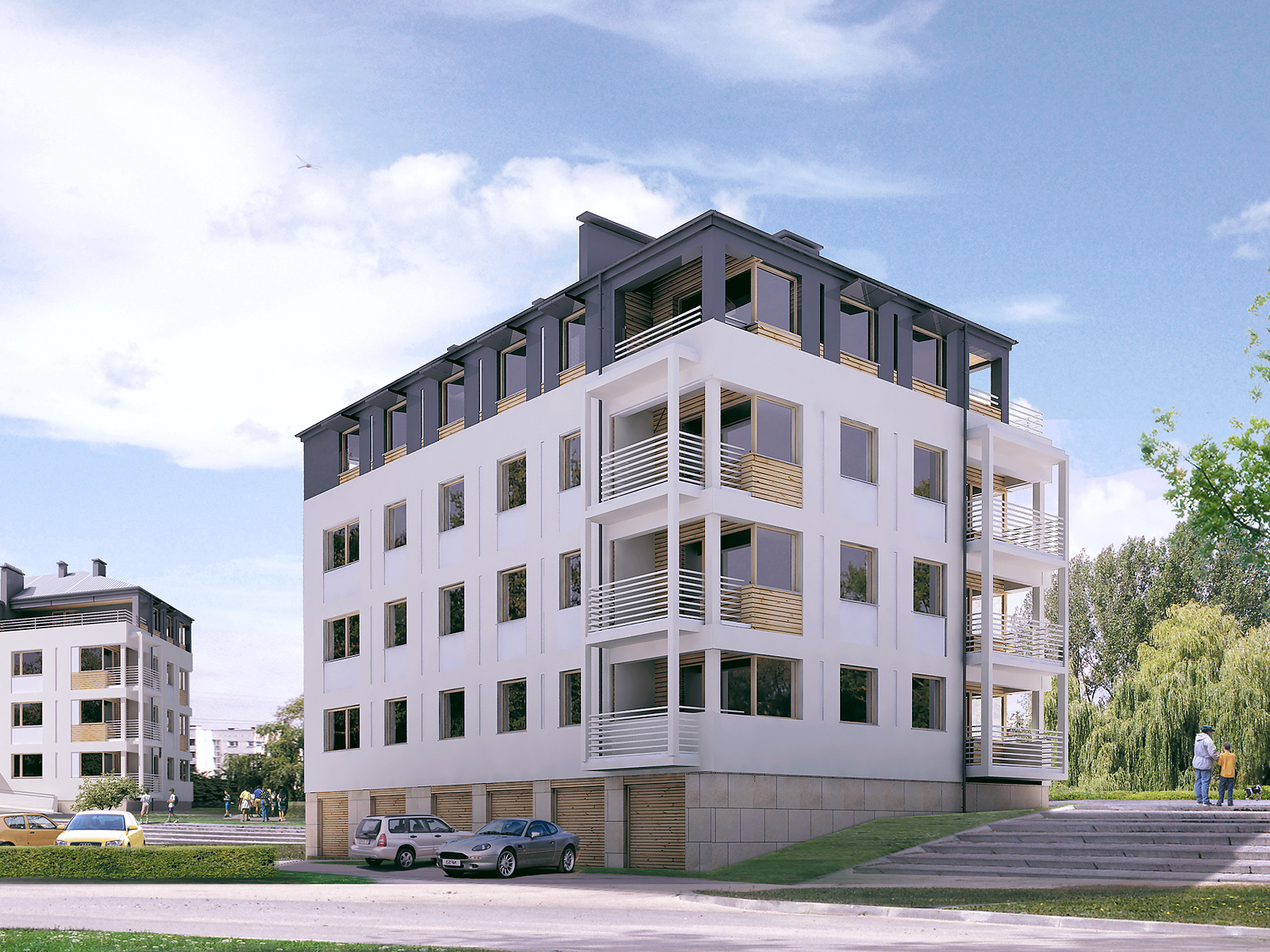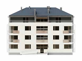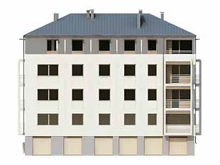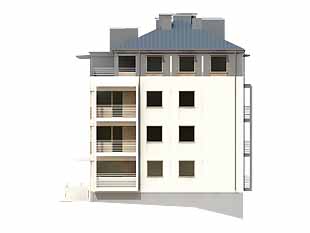 Dom mieszkalny, wielorodzinny (11-mieszkaniowy), podpiwniczony. W piwnicy zaprojektowano sześć stanowisk garażowych, komórki lokatorskie i pomieszczenie techniczne. Na czterech kondygnacjach mieszkalnych zaprojektowano jedenaście mieszkań. Zwarta bryła budynku.