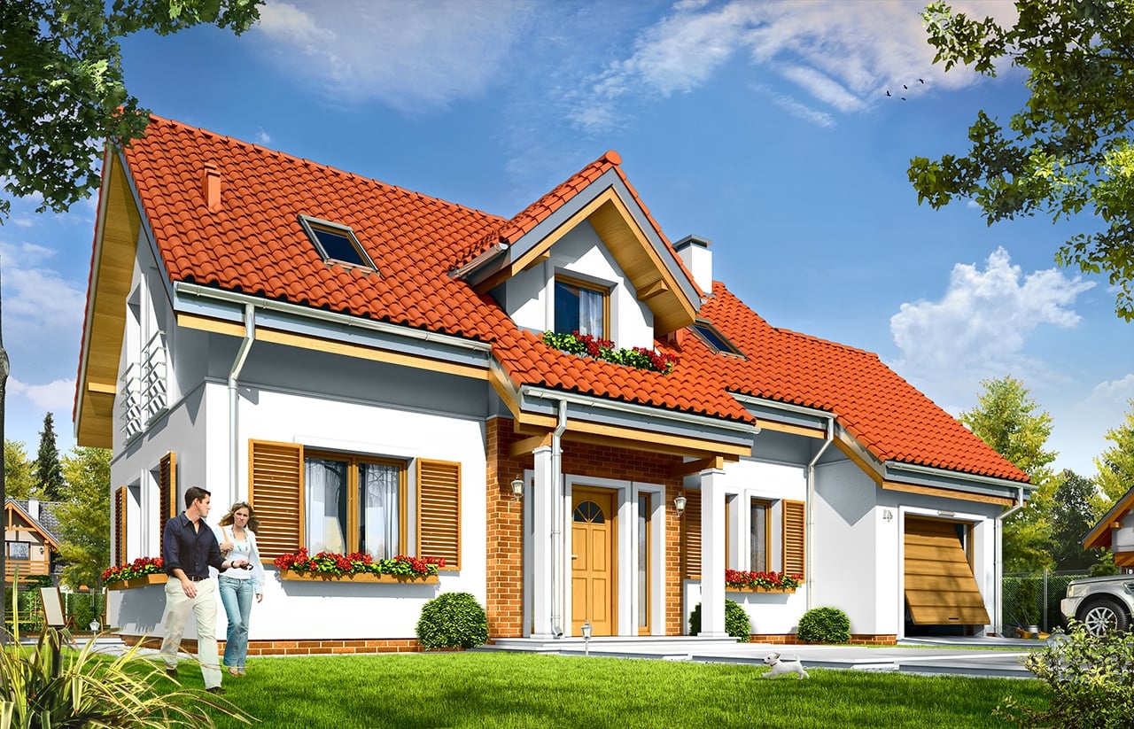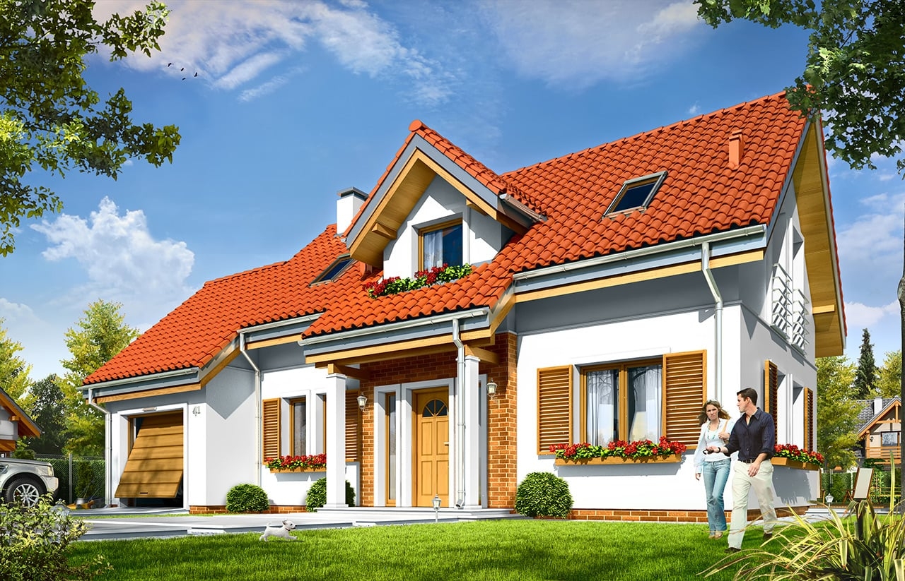 Projekt domu Lucky to dom jednorodzinny, dla 4- 6-osobowej rodziny, parterowy z użytkowym poddaszem, zaprojektowany na planie litery „L”, z osłoniętym z dwóch stron tarasem, oraz z dobudowanym garażem. Dom Lucky dzięki aż sześciu pokojom doskonale nadaje się dla większej rodziny, z większą gromadką dzieci, bądź dla rodziny trzypokoleniowej. Architektura domu jest bezpretensjonalna – dom jest po prostu ładny. Udane proporcje i połączenie brył tworzy budynek o ludzkiej skali, nie przesadzony, który doskonale wpasuje się w każde otoczenie. Połączenie tradycyjnej stylistyki z nowoczesnymi materiałami i kolorystyką tworzą udany efekt. Parter domu to otwarta przestrzeń dzienna, z centralnym holem i dekoracyjnymi schodami, salon z kominkiem i ścianą TV, otwartą kuchnią i jadalnią. Razem pomieszczenia te tworzą jednoprzestrzenne duże wnętrze dzienne, ładnie otwarte na taras i ogród. Na parterze mamy dodatkowy pokój, łazienkę, kotłownię i garaż. Z kuchni dostępna jest spiżarnia. Na poddaszu zaprojektowano aż cztery pokoje, w tym osobny apartament rodziców z własną łazienką, garderobą i balkonem, oraz dużą łazienkę dla wszystkich domowników. Funkcjonalność wnętrza i sensowne wykorzystanie przestrzeni idzie w projekcie w parze z energooszczędnymi rozwiązaniami. Dom jest bardzo dobrze izolowany – w łatwy sposób można go dostosować do standardu NF40. Budynek ma prostą konstrukcję – będzie łatwy w budowie, a dzięki energooszczędności, niedrogi w późniejszym utrzymaniu. Projekt domu Lucky posiadamy również w odbiciu lustrzanym. Zapraszamy !