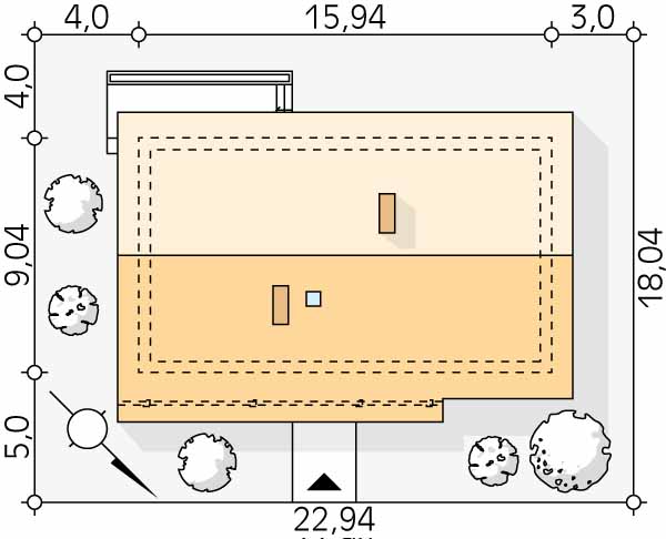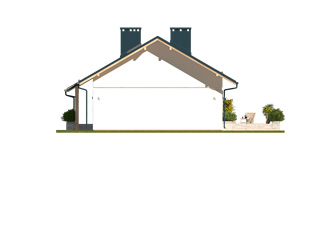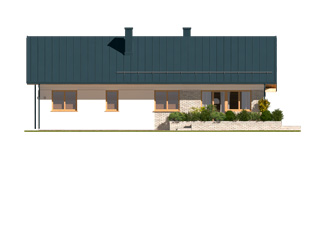 MAHOŃ to projekt domu parterowego podpiwniczonego o powierzchni 112m2. Bryła budynku została rozplanowana na planie prostokąta i przykryta dachem dwuspadowym. Minimalistyczna elewacja o jasnych kolorach składa się z białego tynku i cegły klinkierowej o szarym odcieniu. Drewniane elementy wykończeniowe oraz stolarka okienna i drzwiowa kontrastują z ciemnym dachem wykończonym blachą. Dostęp do garażu odbywa się za pomocą piwnicy połączonej schodami z resztą domu. Na parterze znajdują się trzy pokoje, łazienka z wanną oraz prysznicem i kuchnia połączona z jadalnią oraz salonem. Bezpośredni dostęp na strych zapewniają schody.