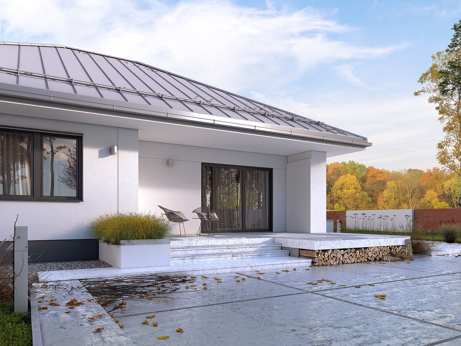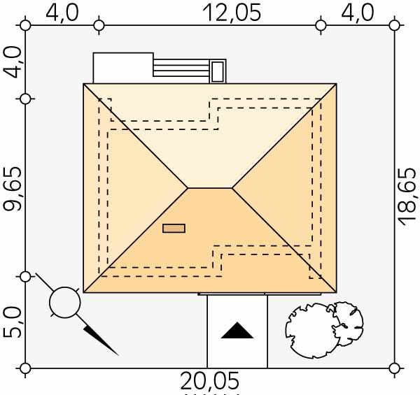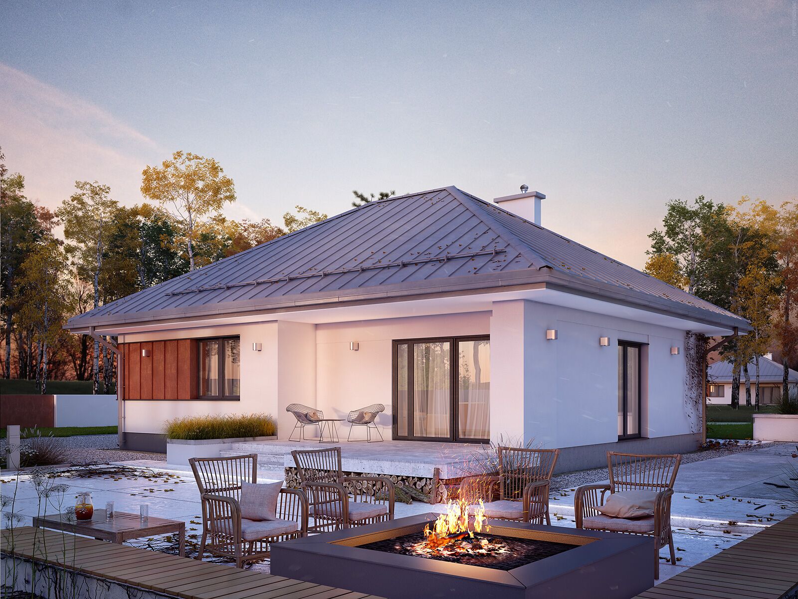 Niewielki, oszczędny dom parterowy spełniający potrzeby 2-3 osobowej rodziny. Program użytkowy podzielono na 2 strefy. Część dzienną tworzy obszerny salon z przylegającą kuchnią i spiżarnią. W części nocnej przewidziano sypialnię , łazienkę oraz dodatkowy pokój mogący pełnić funkcję pokoju dziecka lub gabinetu. W pobliżu wejścia zaprojektowano wydzieloną kotłownię. W jej sąsiedztwie od strony salonu przewidziano również miejsce na kominek. Zaletą projektu jest zadaszony taras dostępny z części dziennej, wydzielona spiżarnia w sąsiedztwie kuchni oraz podcień w strefie wejściowej do domu. Rozwiązania materiałowe nadają budynkowi spójny, nowoczesny charakter. Mak 2 jest projektem energooszczędnym, który idealnie wpisuje się na działki z wjazdem od północy.