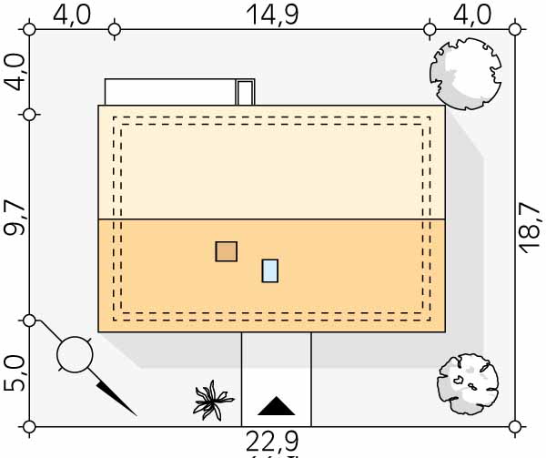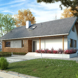 Projekt Mak 4 to projekt domu parterowego z użytkowym poddaszem. Prosta bryła budynku została przykryta dwuspadowym, co czyni dom niedrogim w budowie i utrzymaniu. W projekcie zaprojektowano nieduże poddasze użytkowe, co jest idealną opcją dla rodzin planujących wykończenie poddasza w przyszłości. Parter stanowi w pełni funkcjonalną strefę życiową z podziałem na część dzienną i nocną. W strefie dziennej znajduje się otwarta kuchnia ze spiżarnią, jadalnia oraz przestronny salon. W strefie nocnej na parterze zaprojektowano dwie sypialnie oraz wygodną łazienkę. Na poddaszu znajdują się dodatkowe dwa duże pokoje z szafami wnękowymi pod skosami oraz łazienka z prysznicem. Uzupełnieniem układu funkcjonalnego jest przedsionek z miejscem na szafę oraz wejściem do kotłowni dostosowanej zarówno pod ogrzewanie gazowe jak i na paliwo stałe.