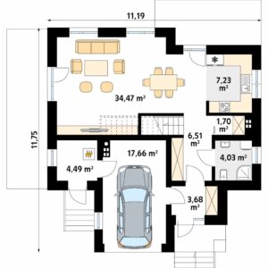 Malachit to nieduży projekt domu z użytkowym  poddaszem oraz garażem w bryle budynku.  Jest to nowoczesny projekt domu, który wyróżnia się kształtem bryły, która nawiązuje do figur geometrycznych.  Nowoczesny charakter budynku podkreśla również dobór materiałów wykończeniowych.  Biały tynk został skomponowany z drewnianą szalówką oraz szarą blachą na rąbek, którą pokryto dwuspadowy dach.  Program funkcjonalny budynku został podzielony na dwie strefy użytkowe.  Na parterze domu znajduje się część dzienna z przestronnym salonem, jadalnią oraz kuchnią z przylegającą do niej spiżarnią.  Elementem charakterystycznym wnętrza są wysokie przeszklenia, które podkreślają nowoczesny charakter budynku.  Układ funkcjonalny parteru uzupełnia łazienka oraz jednostanowiskowy garaż z przejściem do kotłowni.  Na poddaszu zaprojektowano trzy pokoje oraz rodzinną łazienkę.  Główna sypialnia gospodarzy posiada dodatkowo prywatną garderobę oraz łazienkę.  W korytarzu znajduje się wyjście na balkon, stanowiący jednocześnie zadaszenie tarasu na parterze.