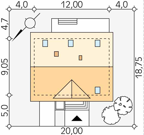 Jednorodzinny budynek mieszkalny, parterowy z użytkowym poddaszem, niepodpiwniczony, przeznaczony dla 4-osobowej rodziny. Na parterze zaprojektowano część dzienną wzbogaconą o dodatkowy pokój. Na poddaszu przewidziano trzy sypialnie, w tym jedną z garderobą, oraz łazienkę.