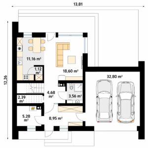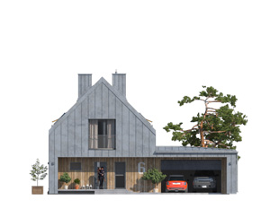 Projekt domu Malutki 4 jest skierowany do inwestorów potrzebujących domu o nowoczesnej bryle z dwustanowiskowym garażem. Budynek zapewni wygodne warunki dla 4-osobowej rodziny. W układzie funkcjonalnym zastosowano podział na strefę wspólną i prywatną pokrywający się z podziałem na kondygnacje. Poddasze jest przestrzenią przeznaczoną dla domowników. Kuchnia, jadalnia i pokój dzienny tworzą wspólną otwartą przestrzeń o dużych przeszkleniach zapewniających dostęp światła dziennego. Naturalnym powiększeniem części dziennej jest zadaszony taras i pergola, które stanowią atrakcyjne, osłonięte miejsce do wypoczynku na świeżym powietrzu. Dodatkową zaletą projektu jest niewielka spiżarnia będąca częścią kuchni. Na poddaszu znajdują się trzy sypialnie, łazienka oraz garderoba.