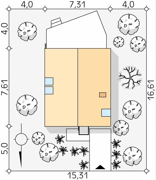 Mandarynka 2 to projekt powstały z myślą o 3-osobowych rodzinach. Oszczędna architektura zostanie doceniona przez miłośników nowoczesnych rozwiązań. Formę budynku tworzy prosta kompozycja brył różniących się fakturą i kolorem materiałów. Cegła i drewniane akcenty przyciągają uwagę i w połączeniu z dwuspadowym dachem sprawiają, że budynek już na pierwszy rzut oka kojarzy się z przytulnym schronieniem. Zastosowane w projekcie okno kolankowe jest ciekawym elementem elewacji, jednak co ważniejsze doskonale doświetla wnętrze i umożliwia korzystanie z okna mimo wysokiej ściany kolankowej. Podział funkcjonalny budynku odpowiada podziałowi na kondygnacje – poddasze przeznaczono na sypialnie, a otwarty parter jest przestrzenią wspólną oświetloną przez panoramiczne okno od strony ogrodu z tarasem. Prosta bryła i niewielkie rozmiary sprawiają, że dom jest tani w budowie.