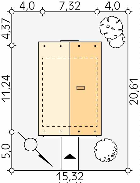 Jeden z najmniejszych domków jednorodzinnych z tarasami przy ścianach szczytowych. Budynek o prostej konstrukcji, łatwy w budowie. Dom po powiększeniu zyskał dodatkowy pokój na parterze. Funkcjonalny układ wnętrza. Możliwość ogrzewania kominkiem.
