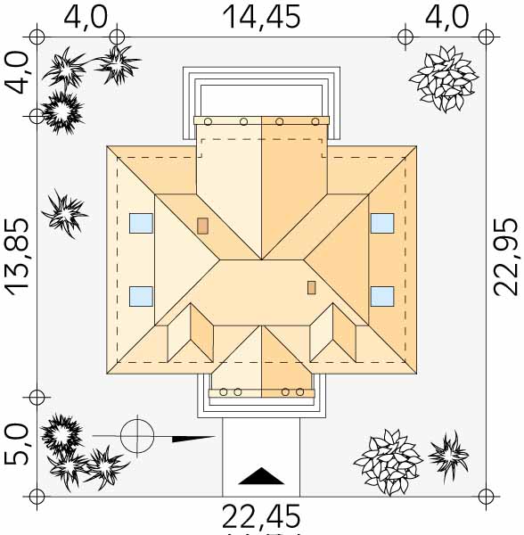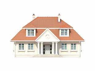 Dom jednorodzinny, parterowy z użytkowym poddaszem, niepodpiwniczony, przeznaczony dla 4 – 6-osobowej rodziny. Na parterze, obok kuchni ze spiżarnią i małej kotłowni, zaprojektowano okazały pokój dzienny, połączony z pokojem kominkowym oraz aneks, składający się z dwóch pokoi i łazienki. Na piętrze zlokalizowano trzy duże sypialnie, w tym jedną z własną łazienką. Nowoczesny, reprezentacyjny budynek o zwartej bryle, z elementami klasycznymi oraz dachem mansardowym.