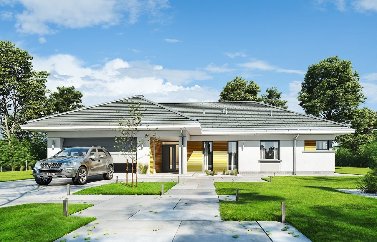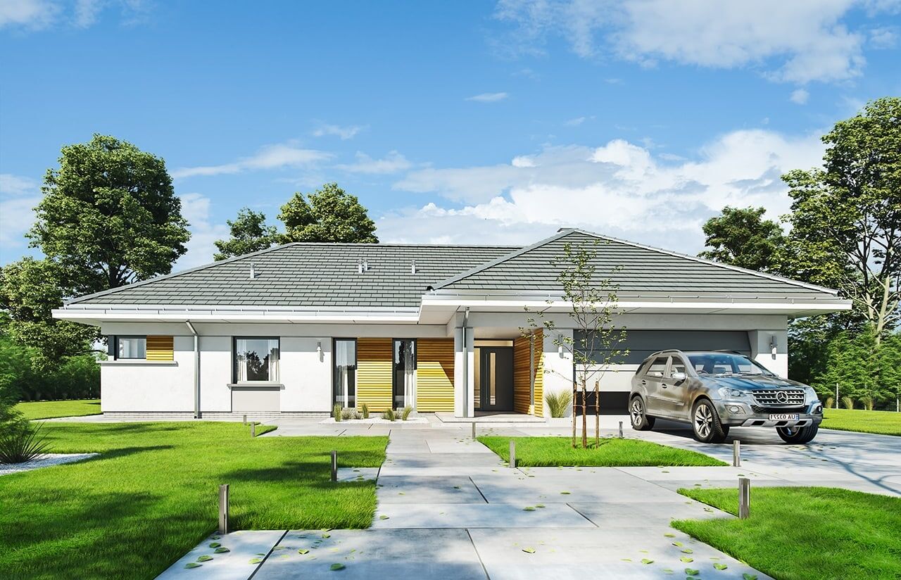 Projekt domu Parterowy 2 to nieco powiększona wersja projektu „Parterowy”. Jest to dom dla 4- 5-osobowej rodziny, jednokondygnacyjny, ze wszystkimi pomieszczeniami dziennymi na parterze, zbudowany na planie litery T”, przykryty łagodnym wielospadowym dachem. Projekt domu Parterowy 2 przeznaczony jest dla inwestorów mających luksus odpowiednio dużej działki, na której mogą sobie pozwolić na parterowy domek. W zamian otrzymują komfortowy bungalow, z pomieszczeniami na jednym poziomie, z bezpośrednim kontaktem z otaczającym ogrodem. Wspaniałe miejsce do życia. Nowoczesna architektura tego „współczesnego dworku ;)” podkreślona została dużymi przeszkleniami okien, drewnianymi wstawkami elewacji, oraz narożnymi podcieniami – frontowym kryjącym podest wejściowy, oraz ogrodowym – przekrywającym częściowo taras. Kolorystyka budynku jest stonowana, harmonizująca z otaczającą dom zielenią. Dostojna sylwetka przywodzi na myśl komfort życia i wrażenie bezpretensjonalnego luksusu. Wnętrze domu jest równie ciekawe i atrakcyjne. Podzielone zostało na trzy funkcje, w trzech skrzydłach domu: gospodarczą, dzienną i nocną – z sypialniami. Części domu połączone są holem i przedsionkiem wejściowym. Do domu wchodzimy przez ładny przedsionek – w bok do dwustanowiskowego garażu (ze strychem – magazynem) i kotłowni, oraz na wprost, do części dziennej domu. Cześć dzienna składa się z holu, salonu z aneksem jadalnym i kuchnią. Nad salonem zaprojektowano antresolę ze schodkami i widokiem na pustkę nad pokojem dziennym. Na antresoli można urządzić dodatkową przestrzeń rekreacyjną. W środkowym miejscu salonu zaprojektowano ścianę kominkową, oddzielającą częściowo kuchnię od reszty powierzchni. Trzecia część to część prywatna domowników, z apartamentem rodziców, z własną łazienką i garderobą, dwiema sypialniami dzieci z szafami wbudowanymi i własną łazienką, z gabinetem z oknem na front domu, oraz pralnią i dodatkowym wc. Nad tą częścią jest jeszcze dodatkowy strych, dostępny z antresoli nad salonem. Dom ma w sumie prostą konstrukcję i jest łatwy w budowie. Mimo rozłożystej bryły będzie niedrogi w realizacji i późniejszym użytkowaniu. Projekt domu Parterowy 2 to doskonała propozycja dla osób planujących budowę wygodnego, jednokondygnacyjnego domu. Dla osób marzących o komforcie przestrzeni i kontakcie z otaczającym dom ogrodem. Zapraszamy do zapoznania się z pełną ofertą pracowni MG Projekt: Parterowy, Parterowy 3, Parterowy 4.