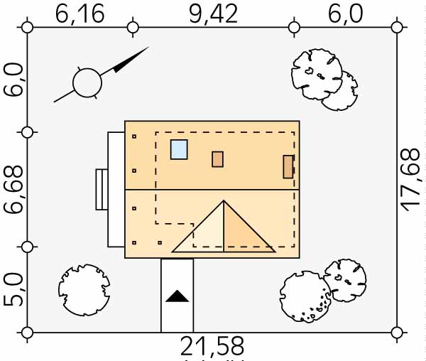 Niewielki jednorodzinny dom drewniany. Na parterze znajduje się część dzienna składająca się z salonu z kominkiem, kuchni z jadalnią i łazienki. Przylega do niej zadaszony taras. Na poddaszu trzy sypialnie z łazienką i garderoba tworzą część nocną domu.