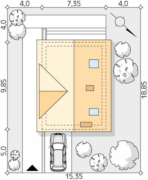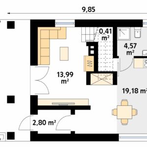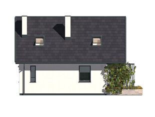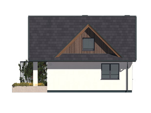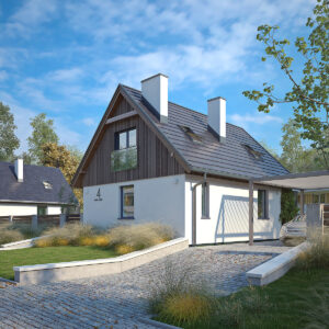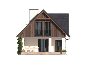 Poziomka 4 to projekt domu z poddaszem użytkowym rozplanowany na 75m2 przestrzeni użytkowej. Dom przykryty dachem dwuspadowym cechuje się kompaktowym rozmiarem i nowoczesnym wykończeniem w postaci białego tynku i szalówki pionowej. Na parterze znajduje się przytulny pokój dzienny w bliskiej odległości od kuchni oraz łazienki, dzięki czemu komunikacja wewnątrz jest prosta i czytelna. Poddasze zostało wyposażone w lukarnę nad łazienką zapewniając dodatkową przestrzeń oraz trzy sypialnie z czego jedna z garderobą.