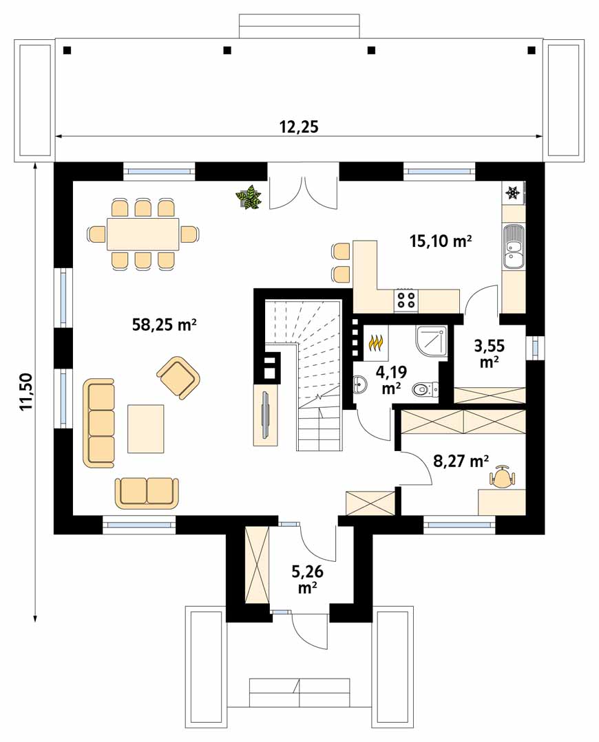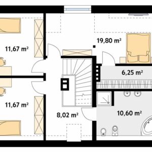 Poziomkowy to jednorodzinny dom z użytkowym poddaszem, który może pełnić rolę zarówno budynku rekreacyjnego, jak również całorocznego. Na parterze znajduje się część dzienna, na którą składa się salon połączony z jadalnią, oraz otwarta kuchnia ze spiżarką. Do dyspozycji mieszkańców na parterze zaprojektowano również dodatkowy pokój oraz łazienkę. Na poddaszu znajdują się trzy sypialnie, garderoba oraz łazienka. Atutem projektu jest zadaszony taras od strony elewacji ogrodowej, która pozwala delektować się urokami natury, niezależnie od aury na zewnątrz.
