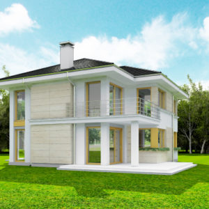 Projekt domu Riwiera 2 to kolejna wersja popularnego projektu Riwiera. Jest to nieco mniejszy wariant domu, z zachowanymi podobnymi rozwiązaniami wnętrz i wyglądu zewnętrznego. Budynek jest piętrowy, z wbudowanym w bryłę garażem. Projekt domu Riwiera 2 przeznaczona jest dla 4- 6-osobowej rodziny. Budynek zaprojektowano w stylu miejskiej nowoczesnej willi, z łagodnymi dachami i dużymi przeszkleniami. Elewacje podzielone zostały na poziome pasy, a różne okładziny i kolory urozmaicają powierzchnie ścian. Znakiem firmowym „Riwiery 2” są piękne duże okna. Część z nich sięga od podłogi do sufitu, dzięki czemu z wnętrza dziennego domownicy będą mieli świetny widok na otaczający ogród. Środek domu podzielono na część dzienną na parterze, oraz sypialnie na piętrze. Do domu wchodzimy przez obszerną sień, z przejściem do garażu i pomieszczenia gospodarczego. Następnie przechodzimy do holu, połączonego z pokojem dziennym i kuchnią, które razem tworzą dużą otwartą przestrzeń. Z holu dostępne są także: schody na piętro, niewielka łazienka i dodatkowy pokój (gabinet lub sypialnia gościnna). Nad jadalnią zostawiono otwarty sufit na antresolę piętra, z oknami o wysokości dwóch kondygnacji, z widokiem na ogródek. Reprezentacyjna ściana kominkowo-telewizyjna będzie ozdobą całego domu. Z salonu wychodzimy na częściowo zadaszony taras i do ogrodu. Na piętrze przewidziano cztery sypialnie, w tym apartament rodziców w osobnej części domu, z własną łazienką i garderobą. Sypialnie dziecięce mają dodatkową łazienkę – z holu. Istnieje możliwość zamknięcia pustki nad salonem i zaprojektowania piątego pokoju na piętrze. Projekt domu Riwiera 2 to przemyślany, bardzo funkcjonalny, energooszczędny dom jednorodzinny. Jego koszt budowy wypada korzystnie w stosunku do uzyskanej powierzchni (pozbawionej skosów), oraz komfortu i wygody mieszkania. Pracownia posiada wersję odbicia lustrzanego oraz inne propozycje tej serii: bazowa (Projekt domu Riwiera), poszerzona o mniejszej głębokości (Projekt domu Rwiera 3) pomniejszona ze zmienionym układem wewnętrznym (Projekt domu Riwiera 4) oraz zmodyfikowana i ulepszona wersja bazowego projektu (Projekt domu Riwiera 5). Zapraszamy!