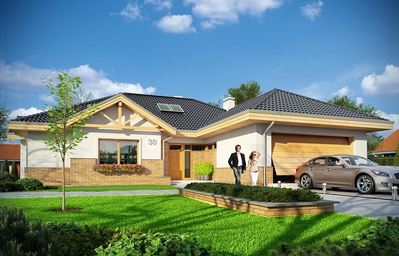 Projekt domu Rozłożysty to fantastyczna komfortowa willa, łącząca w sobie elementy nowoczesności i tradycyjnej formy. Dom jednorodzinny przeznaczony dla 4- 5-osobowej rodziny. Parterowy układ funkcjonalny, gdzie wszystkie pomieszczenia dostępne są z jednego poziomu, rozczłonkowana bryła przykryta łagodnymi dachami, część dzienna z wysokimi sufitami sięgającymi dachu, bliskość wnętrza z otaczającym ogrodem – to wszystko powoduje, że dom będzie wspaniałym miejscem do życia. Każda elewacja jest ciekawa i oryginalna. Front domu, z wykuszem zakończonym daszkiem, oraz mini-dziedzińcem wejściowym, z eleganckimi drzwiami z naświetlem. Elewacja ogrodowa z pięknym zadaszonym tarasem i przeszkleniami salonu. Nawet elewacje boczne – z dodatkowymi wykuszami są interesujące. W elewacjach zastosowano tradycyjne elementy z użyciem współczesnych detali. Dom Rozłożysty ma solidny wygląd, a jednocześnie jest bardzo świeży i nowoczesny. Budynek doskonale wpasuje się w niemal każdy teren – najlepiej będzie wyglądał na większej działce, w otoczeniu rzadszej zabudowy. Projekt domu Rozłożysty obejmuje – na parterze: część dzienną – z salonem, jadalnią, kuchnią i holem, część nocną – z czterema pokojami, oraz część gospodarczą – z garażem i kotłownią. Prócz tego można dowolnie wykorzystać przestrzeń strychu – jako zamknięty magazyn, lub jako otwartą na salon antresolę (na przykład pokój sportowy, czy hobby). Fenomenalną przestrzeń dzienną, z pustką nad salonem i kuchnią zobaczyć można na naszych wizualizacjach wnętrz. Budynek przez rozległy plan i spory dach nie będzie z pewnością najtańszy w realizacji, ale na pewno wart jest szaleństwa. Szczególnie jeśli już mieszkało się wcześniej w domu i spędziło pół życia biegając po schodach i nie wykorzystując w pełni wyższych kondygnacji. Zastosowane energooszczędne materiały, izolacje i instalacje sprawią, że dom nie będzie drogi w utrzymaniu. Pracownia posiada odbicie lustrzane projektu domu Rozłożysty oraz wersję o większej powierzchni 182.75 m2 ze zmienionym układem pomieszczeń (projekt domu Rozłożysty 2).