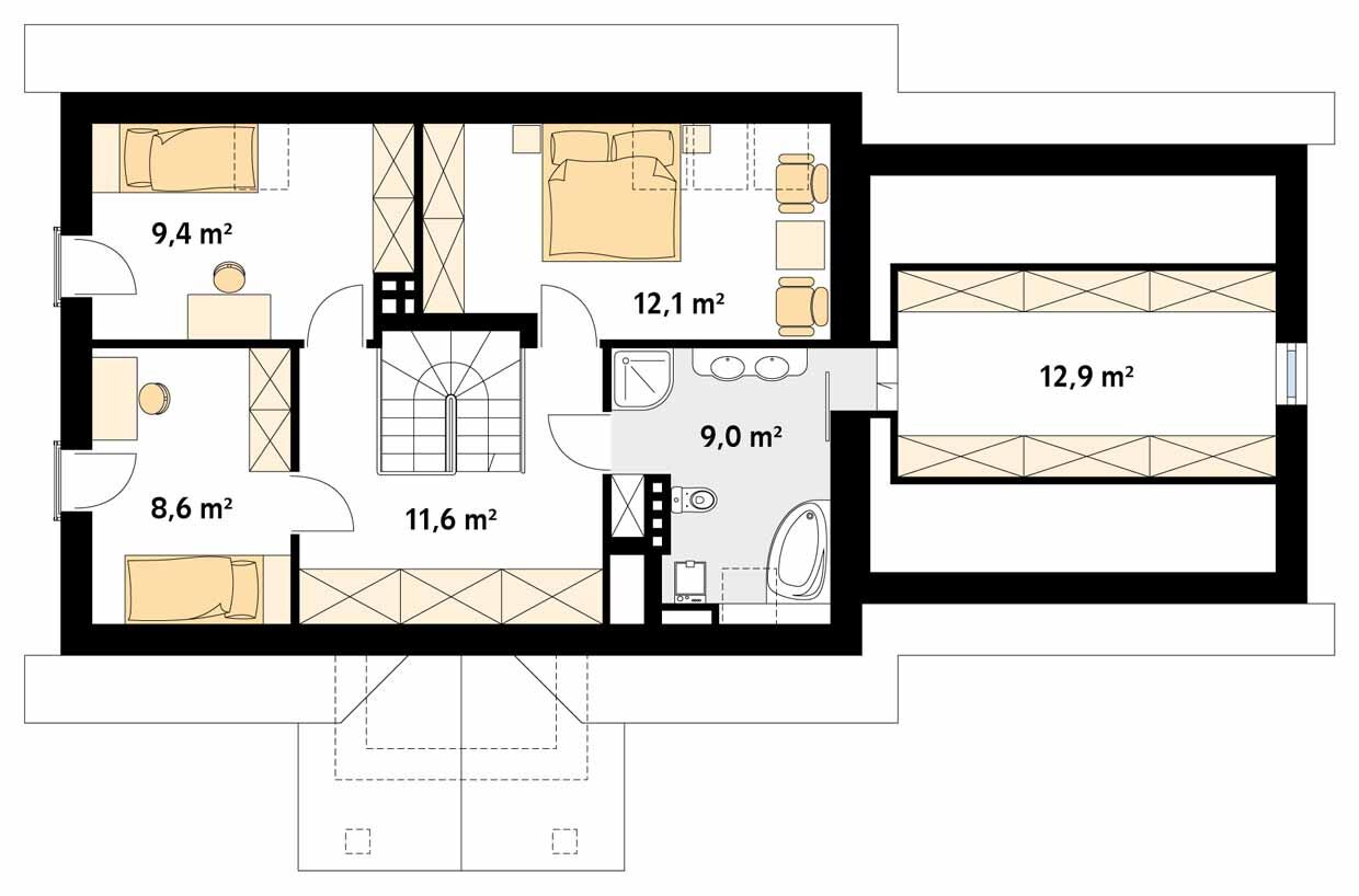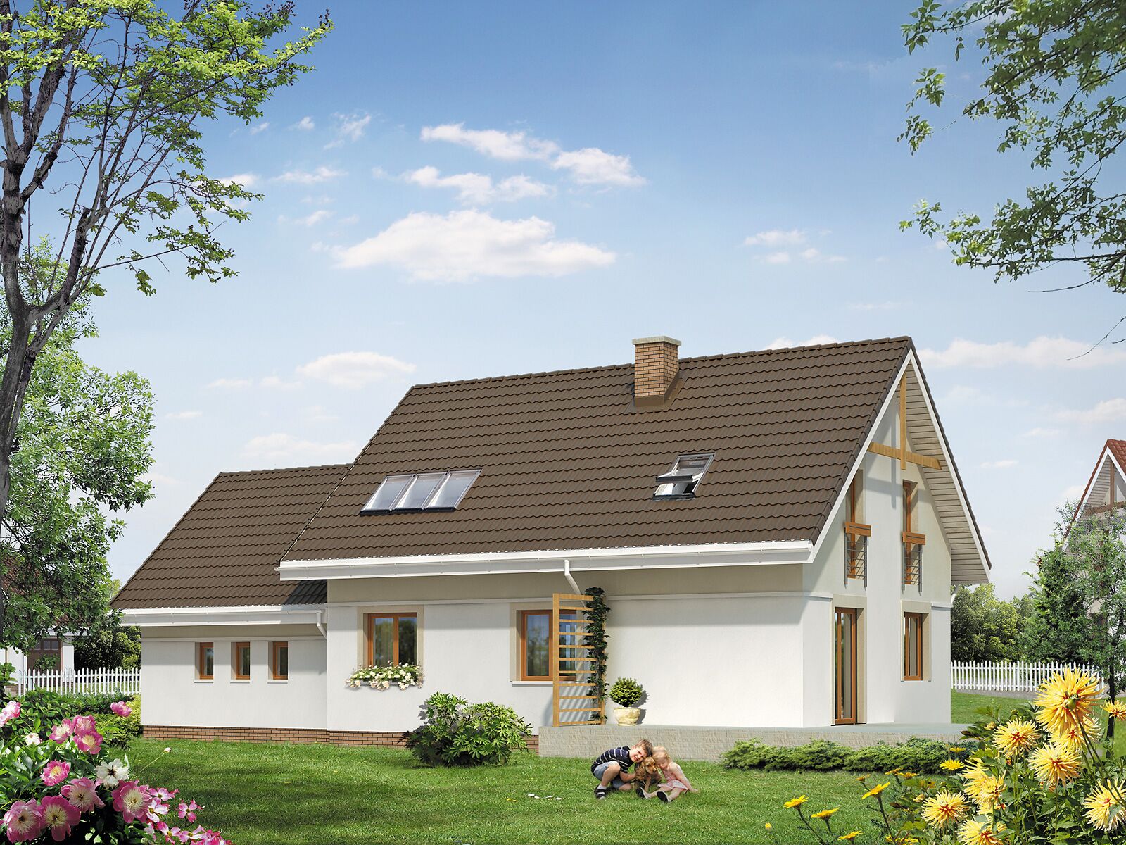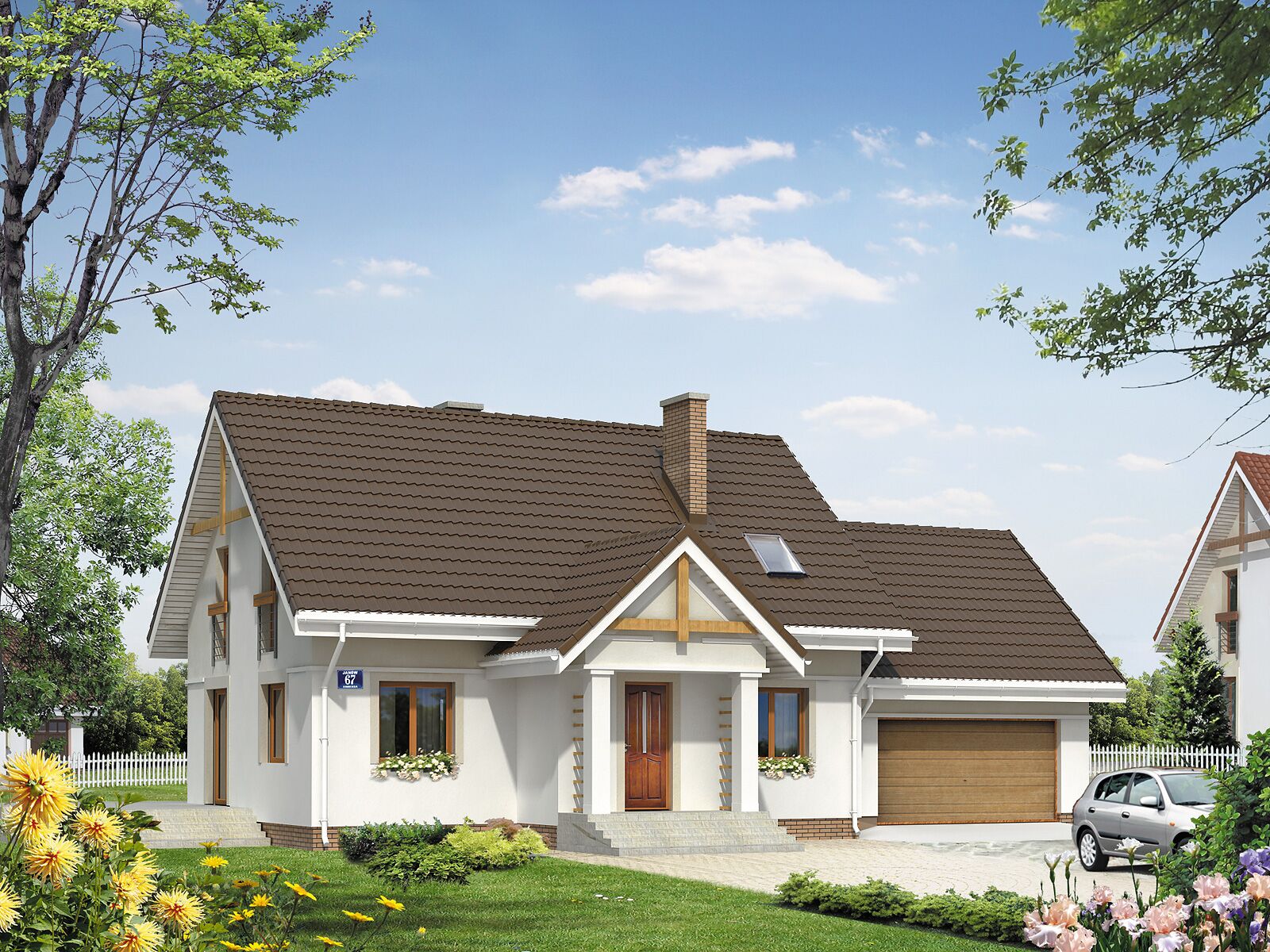Wolno stojący parterowy dom jednorodzinny z użytkowym poddasze, przeznaczony dla 4 – 5-osobowej rodziny. Wyraźny podział na część dzienną i nocną. Na dole gabinet (dodatkowy pokój). Garaż dwustanowiskowy.