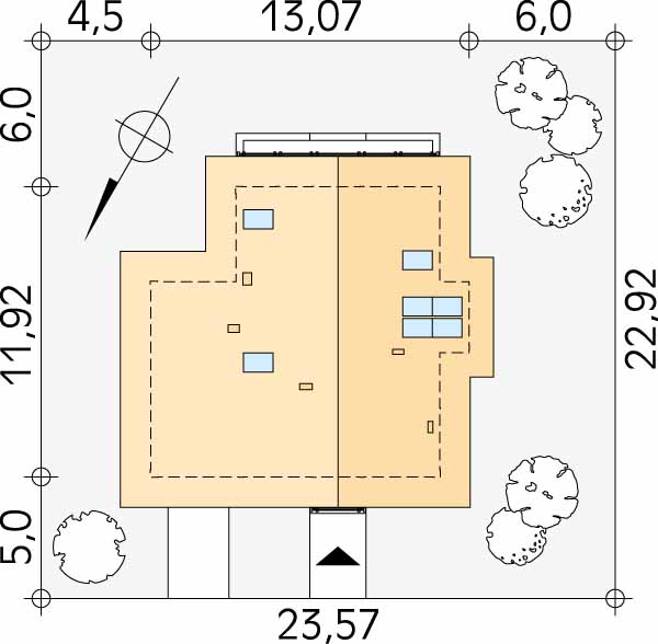 Budynek przeznaczony dla rodziny 4 – 5-osobowej. Zwarta bryła domu oparta na planie prostokąta rozbudowana została o przeszkloną jadalnię i dostawioną bryłę garażu. Charakter domu kształtują drewniane elementy elewacji. Wygodę codziennego użytkowania zapewniają liczne pomieszczenia dodatkowe: pomieszczenie gospodarcze, spiżarnia, garderoby.