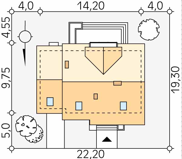 Jednorodzinny budynek mieszkalny z użytkowym poddaszem, przeznaczony dla 4-osobowej rodziny. Na parterze w części dziennej przewidziano przestronny salon z jadalnią. Na niższej kondygnacji domu zaprojektowano kuchnię, garderobę, łazienkę, a w części gospodarczej garaż i kotłownię. Na poddaszu przewidziano trzy sypialnie oraz łazienkę.